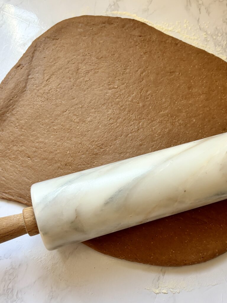 - Lightly flour a work surface and roll the dough into a 12×18” rectangle. Spread the softened butter over the dough, then sprinkle the cinnamon sugar mixture evenly. Starting at the long side, roll the dough into a tight log.
