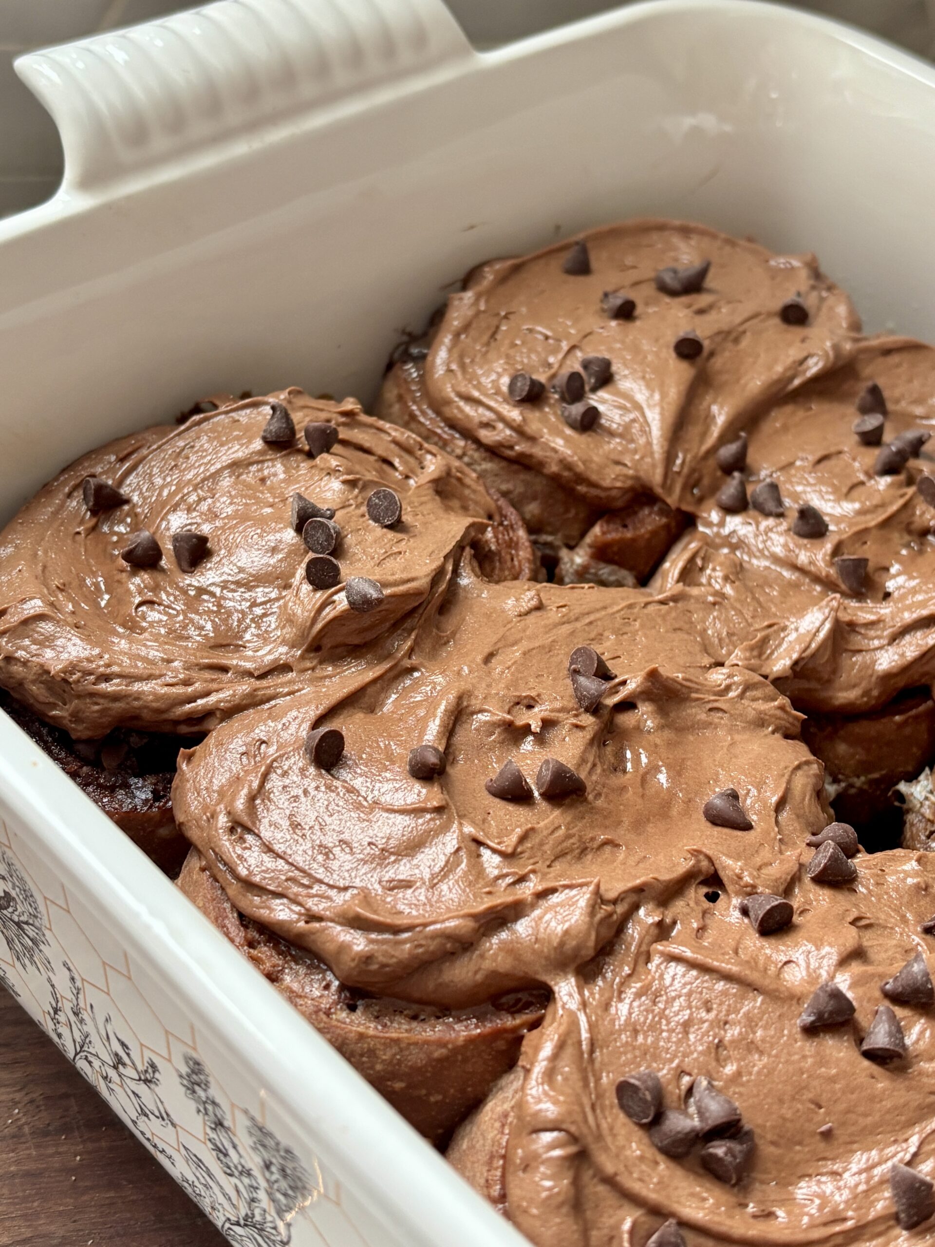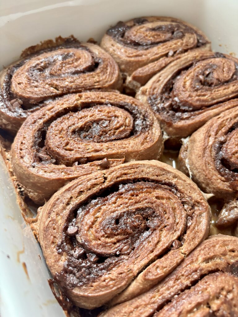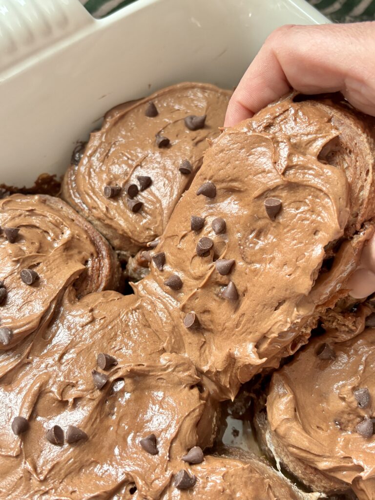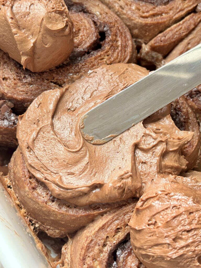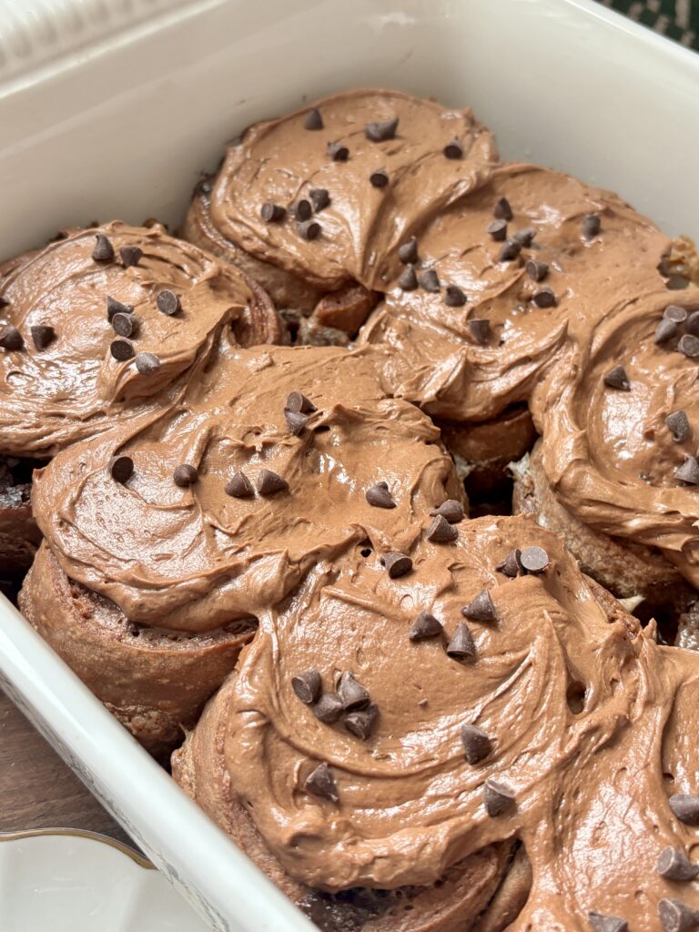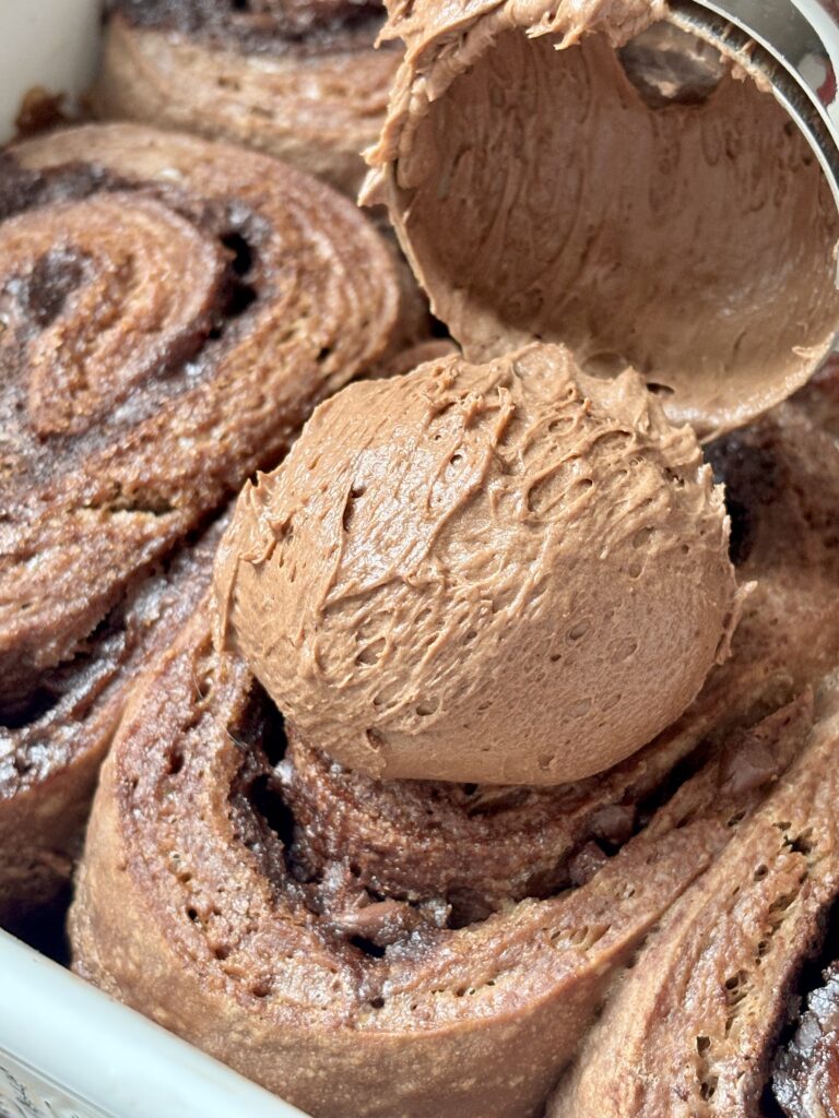 Once baked, the rolls are topped with a luscious chocolate cream cheese frosting that melts into every swirl while the rolls are still warm. Smooth and perfectly chocolatey, the frosting balances the richness of the dough and filling beautifully.