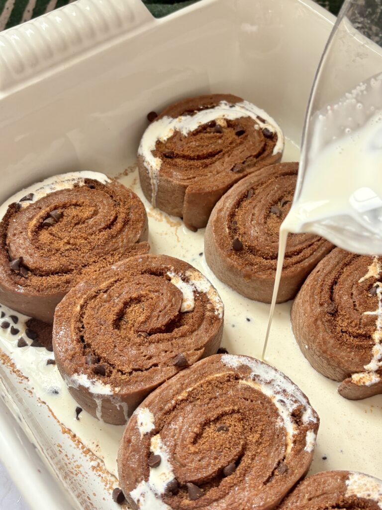 Each roll is generously swirled with a bold chocolate cinnamon filling made with brown sugar, warm cinnamon, cocoa, espresso powder, and mini chocolate chips that melt into a sweet, cinnamon swirl. Just before going into the oven, heavy cream is poured into the bottom of the pan, creating ultra gooey centers and soft, melt in your mouth edges that make these rolls completely unforgettable.