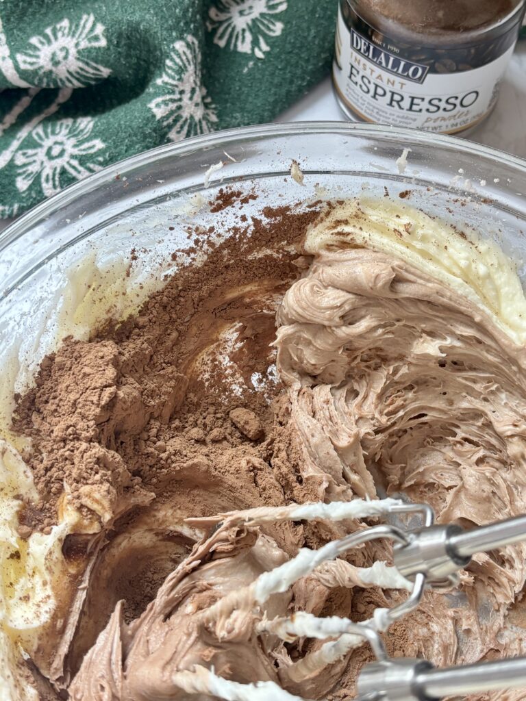 - While rolls bake, beat cream cheese and butter until smooth. Add vanilla. Gradually beat in powdered sugar, cocoa, espresso powder, and a pinch of salt until combined. Slowly pour in the melted chocolate while mixing on low at the same time. Then add heavy cream 1 tbsp at a time and beat until desired spreading consistency is reached.