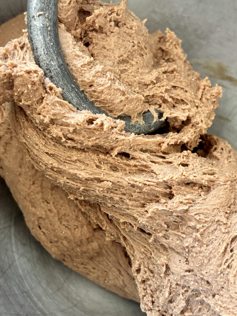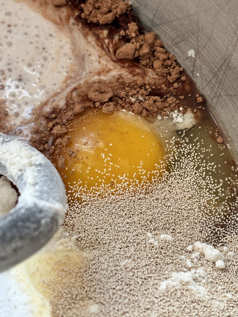 - In a stand mixer fitted with the dough hook, combine softened butter, eggs, granulated sugar, salt, flour, cocoa powder, buttermilk, yeast, and hot coffee. Mix until roughly combined and then knead on medium speed for 4–5 minutes, until smooth and elastic. Cover and let rise 1½ -2 hours, until doubled.
