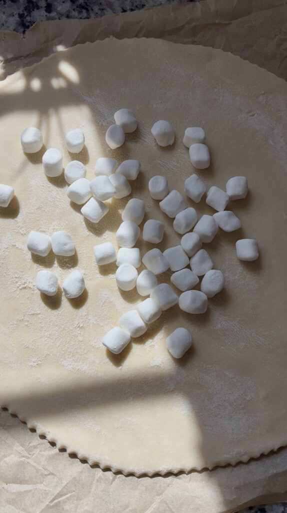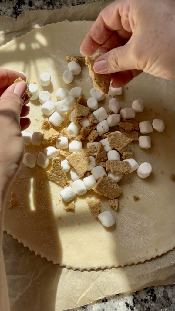 - Sprinkle ½ cup mini marshmallows in the center of the dough, leaving about a 1½-inch border. Top with all chocolate chips, then sprinkle crushed graham crackers evenly over the chocolate.