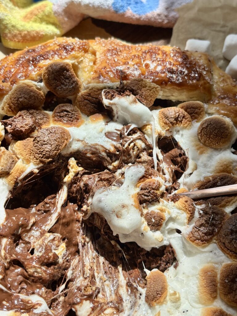 This S’mores Galette is everything you love about classic campfire s’mores, just wrapped up in a buttery, flaky pie crust and baked until golden. Filled with melted chocolate, gooey marshmallows, and a graham cracker crunch. It’s rustic, unfussy, and completely irresistible.