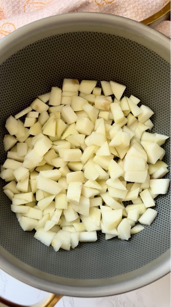 • Reduce heat to simmer, cover, and cook for 10 minutes. Uncover and use a fork, masher, or back of your spatula to crush the pears as much as you can.