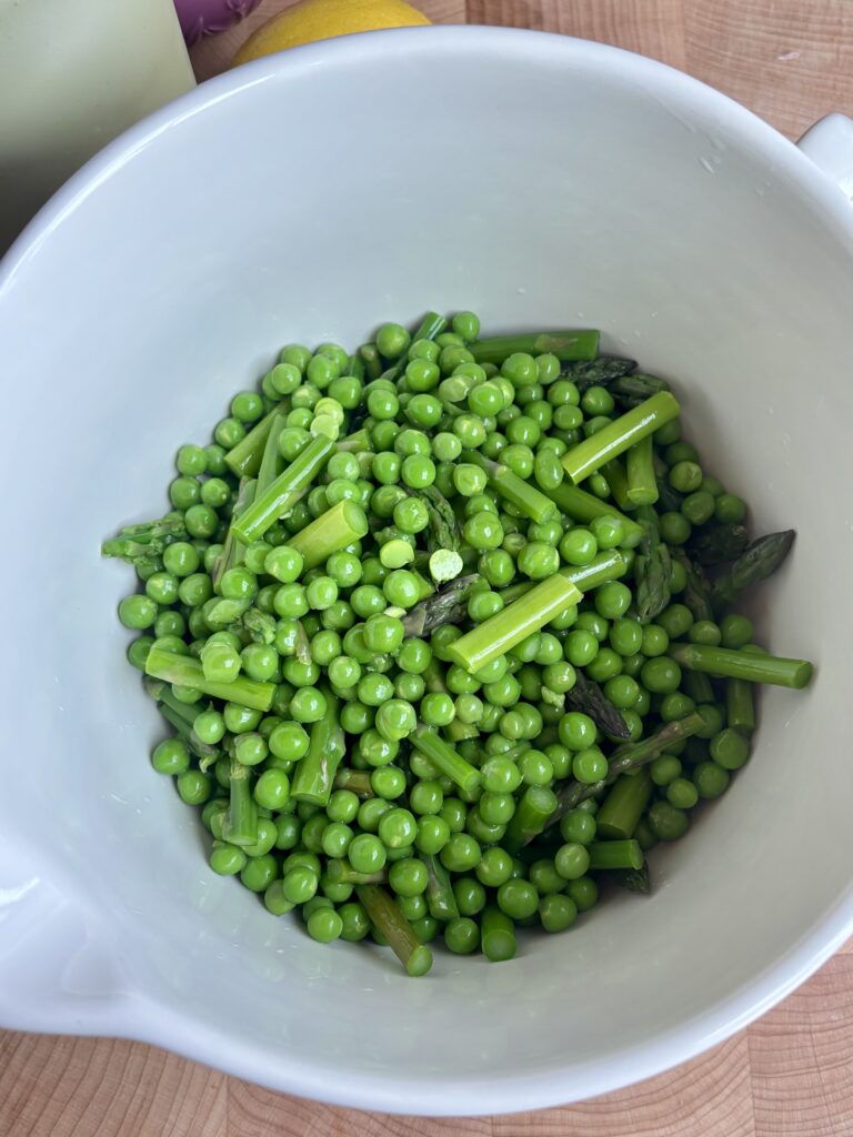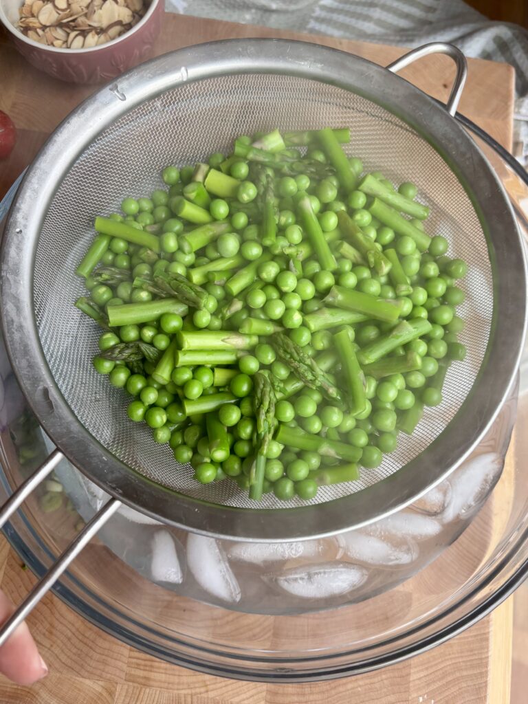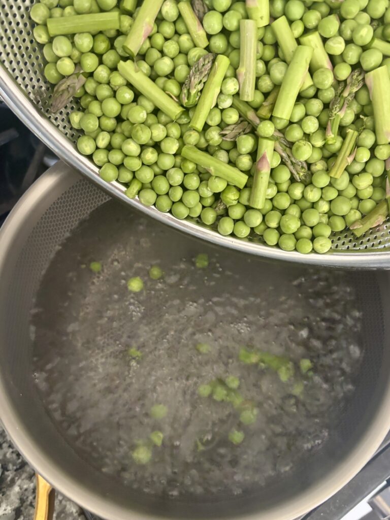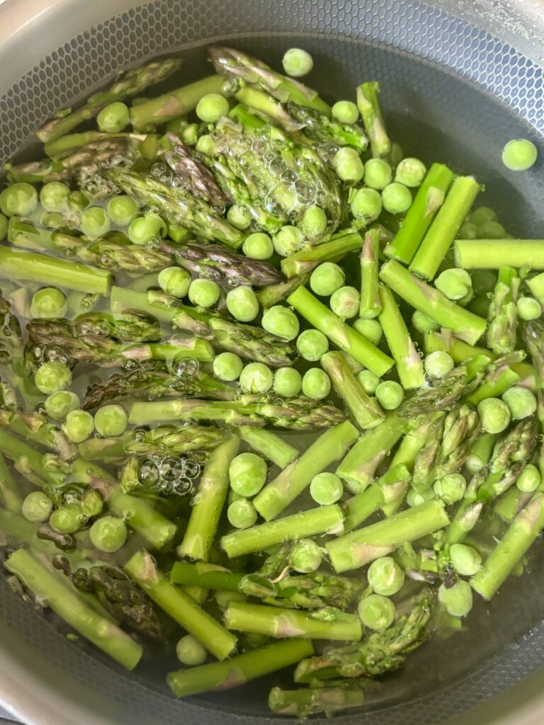 Bring a pot of salted water to a boil. Add peas and cook for about 2 minutes, then immediately transfer them to an ice bath to stop cooking. For asparagus, boil for 2–3 minutes until tender-crisp, then transfer to an ice bath. This keeps them bright, crisp, and perfectly cooked.