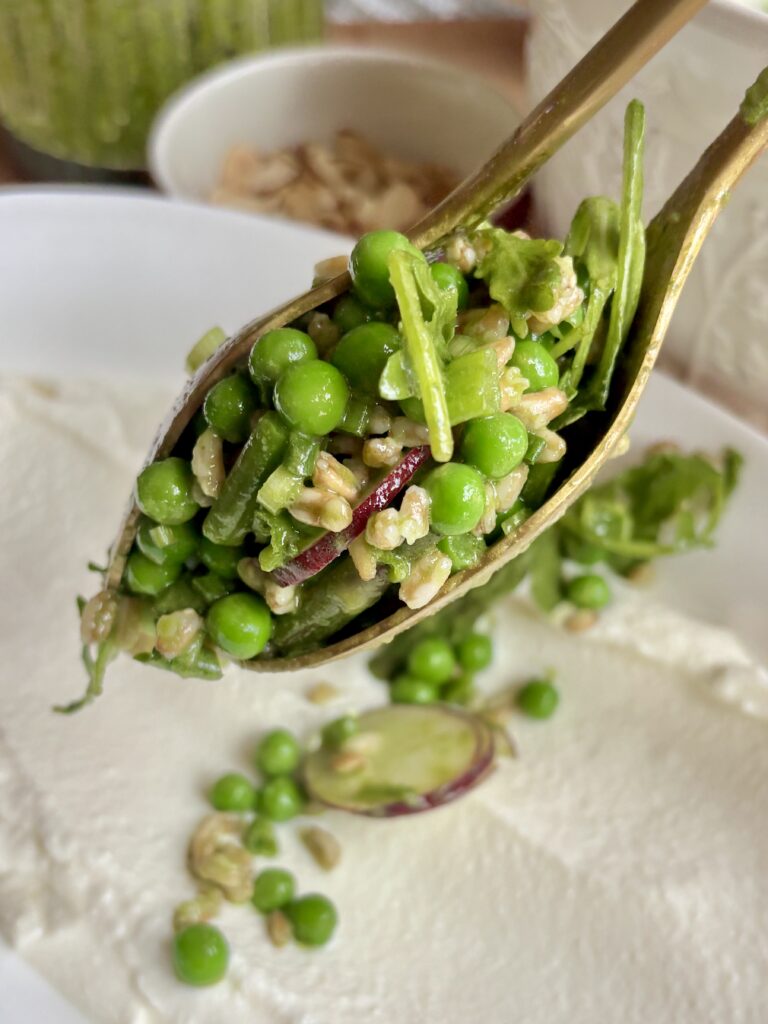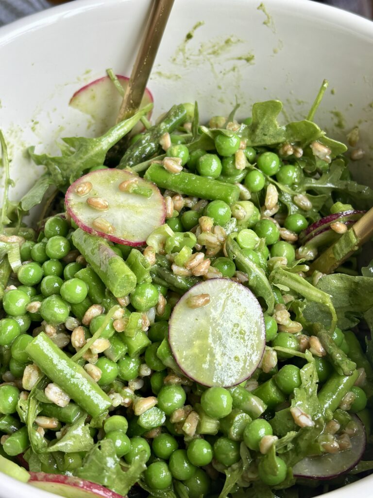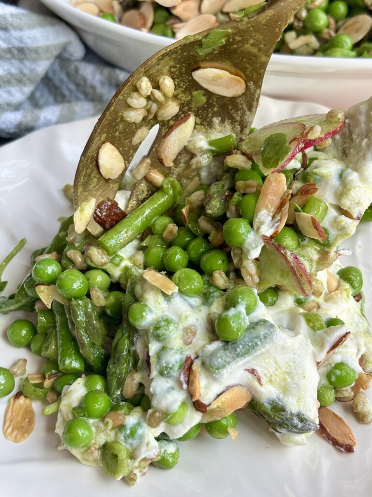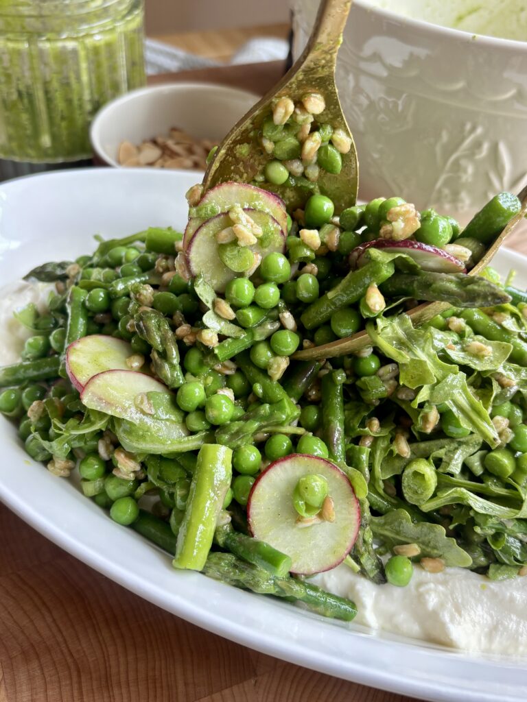 spring pea salad | asparagus salad recipe | whipped ricotta salad | spring salad recipes | easter salads | fresh vegetable salad | basil mint vinaigrette salad | farro salad recipe | healthy spring recipes | entertaining salads | farro and pea salad | easy green salad | summer salad recipe | nourishing salad