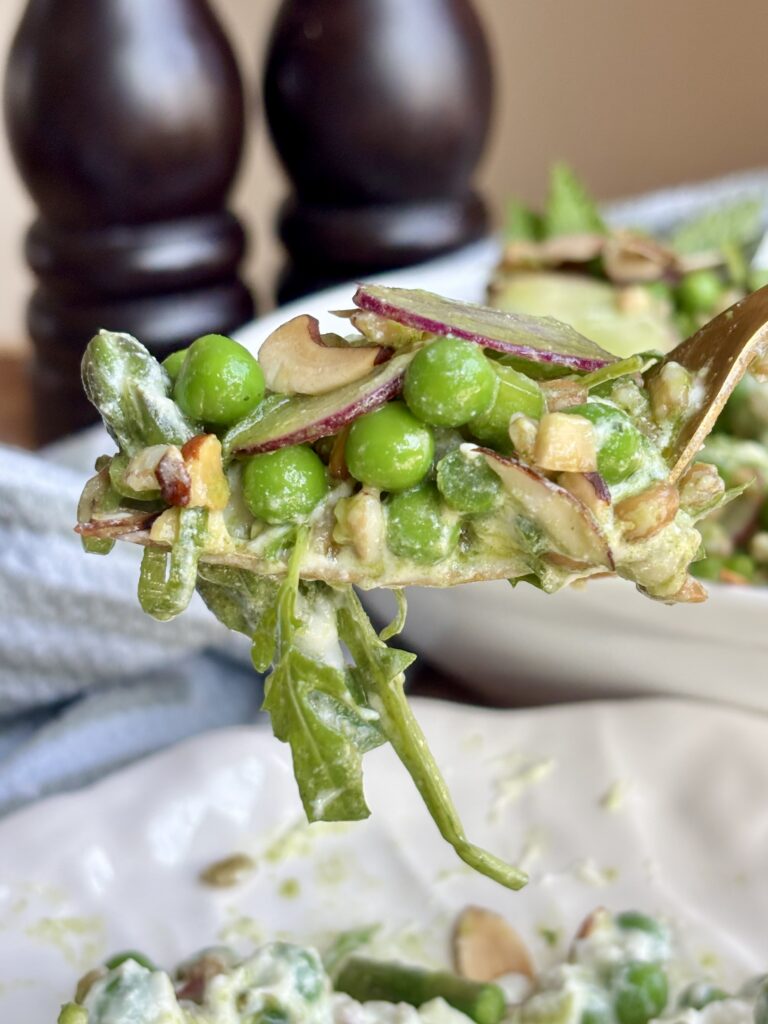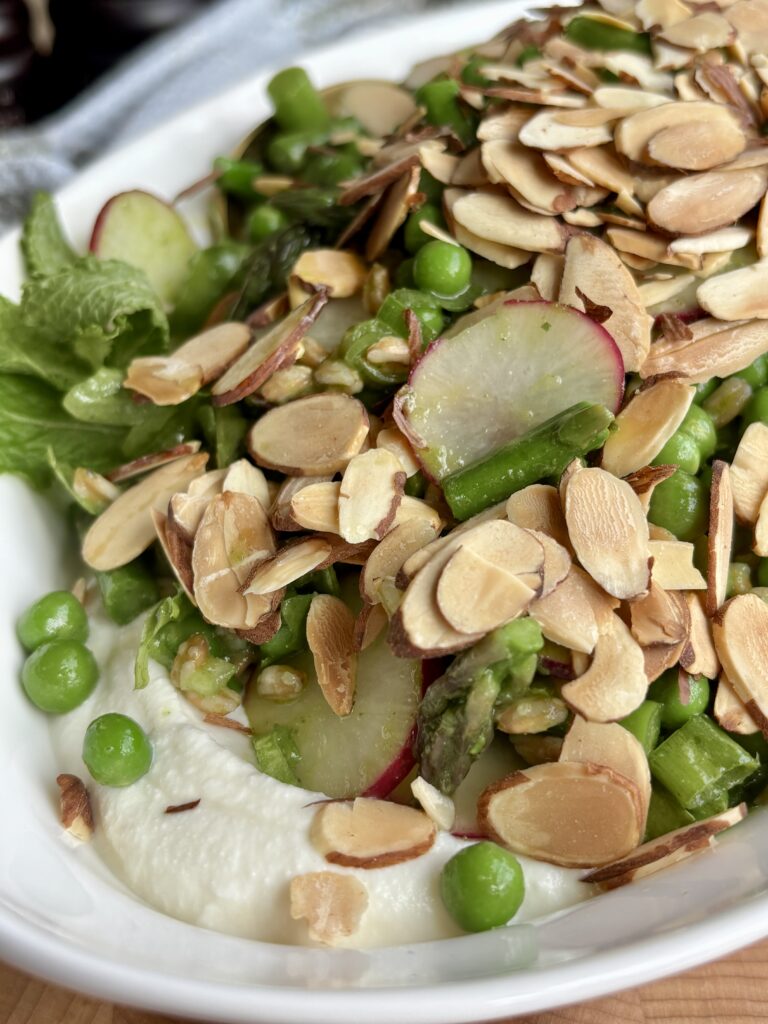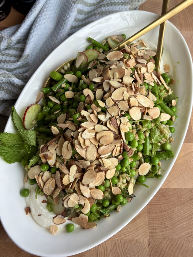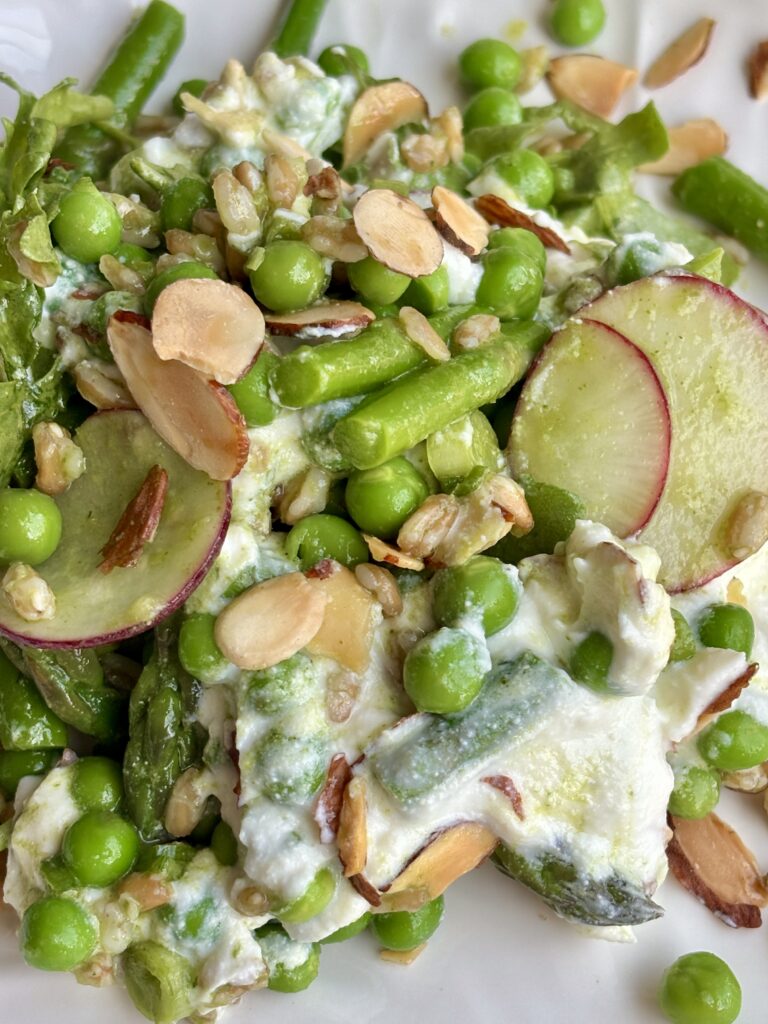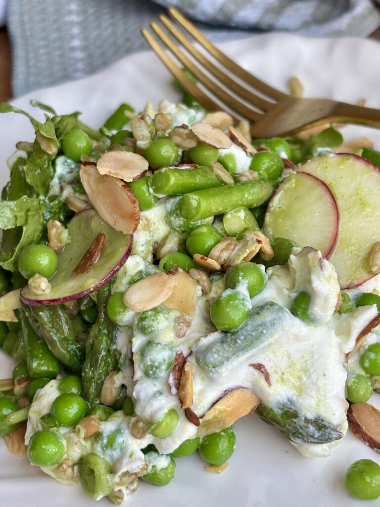 spring pea salad | asparagus salad recipe | whipped ricotta salad | spring salad recipes | easter salads | fresh vegetable salad | basil mint vinaigrette salad | farro salad recipe | healthy spring recipes | entertaining salads | farro and pea salad | easy green salad | summer salad recipe | nourishing salad
