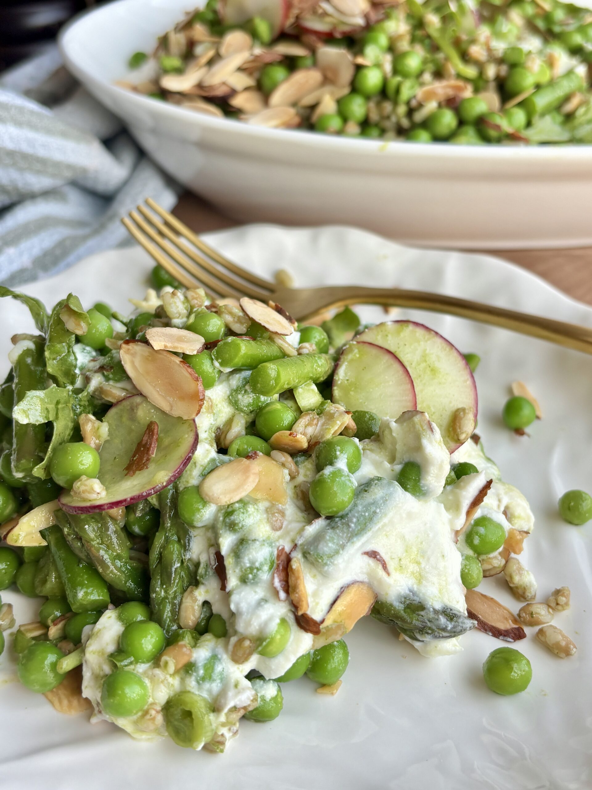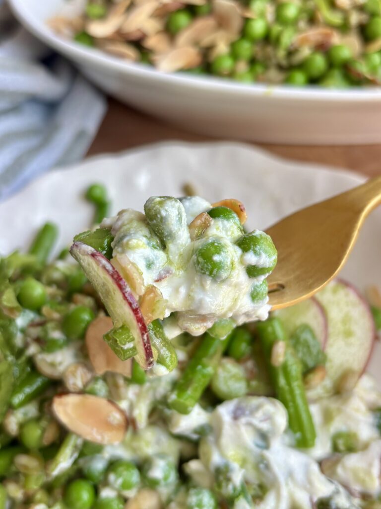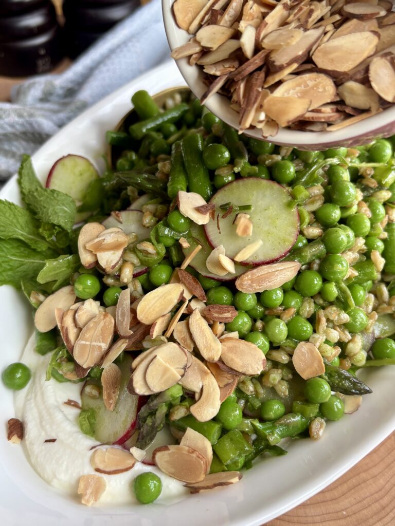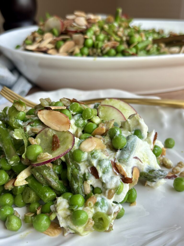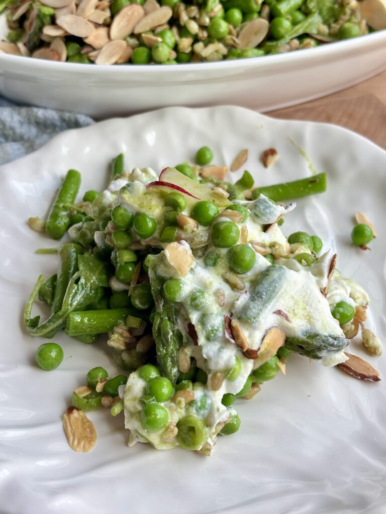 This Spring Pea and Asparagus Salad is everything you want in a warm weather dish to welcome in spring. It’s fresh, vibrant, layered, and full of texture. Sweet blanched peas, tender crisp asparagus, nutty farro, and crisp radishes are tossed in a bright Basil Mint Vinaigrette, then piled over a luscious layer of whipped ricotta that’s lightly sweetened with honey.