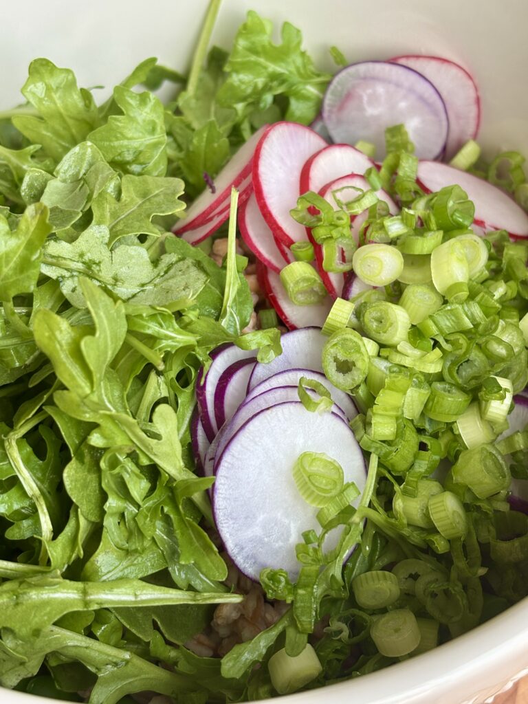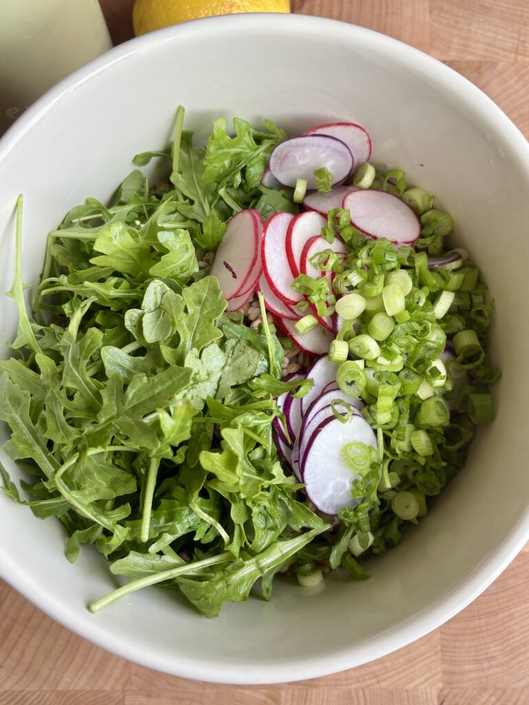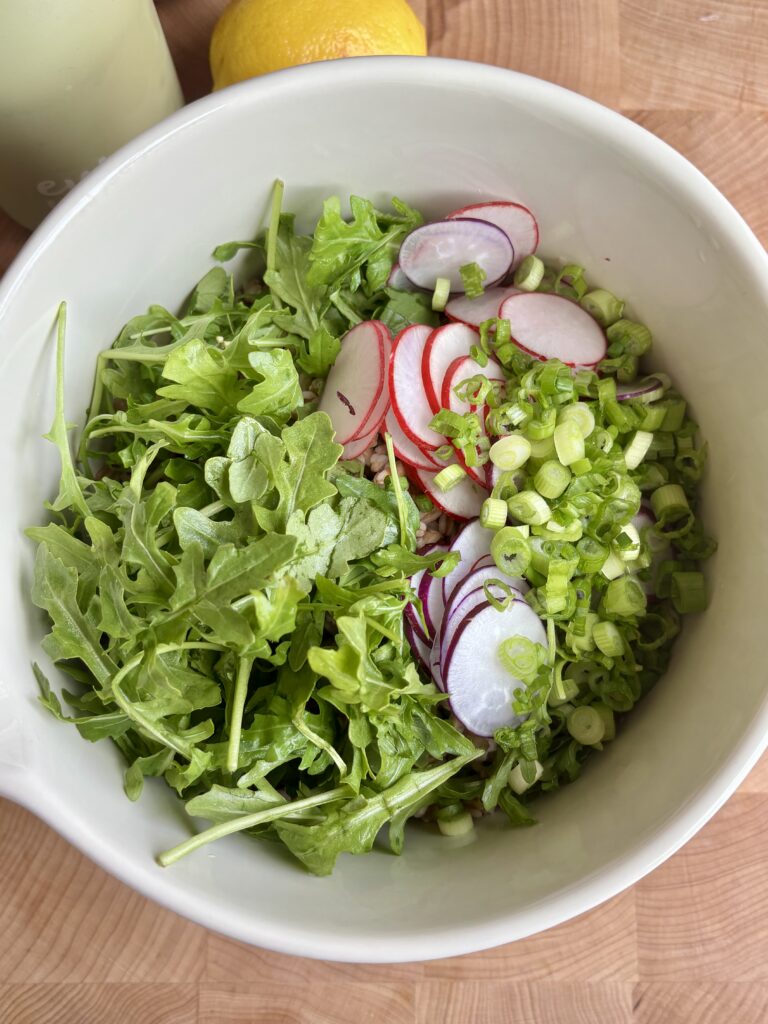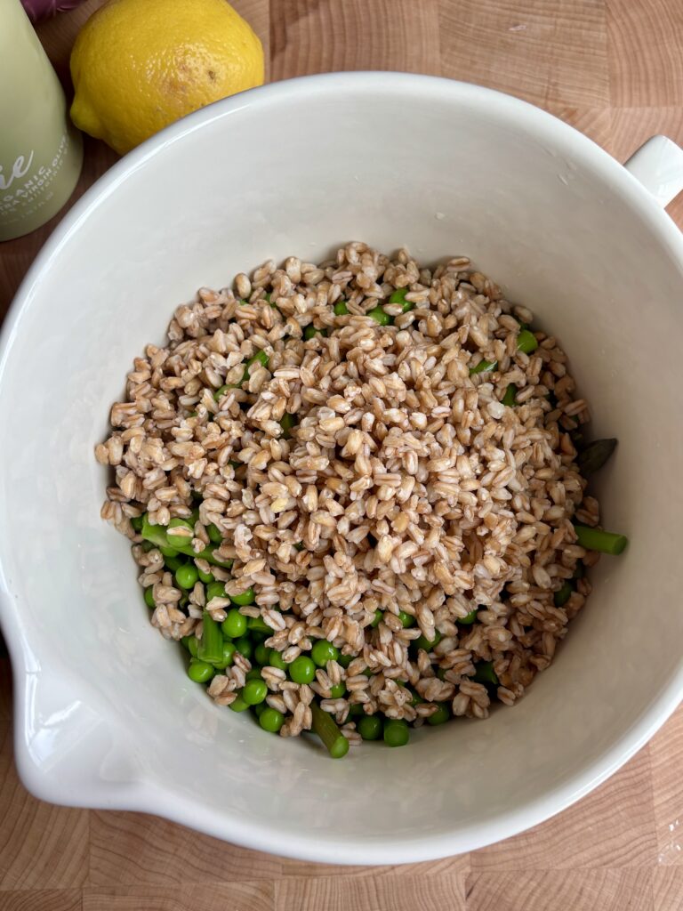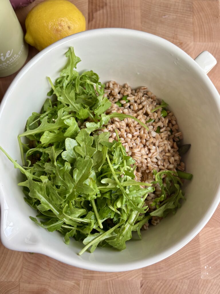 - In a large bowl, combine peas, asparagus, farro, radishes, arugula, and scallions.