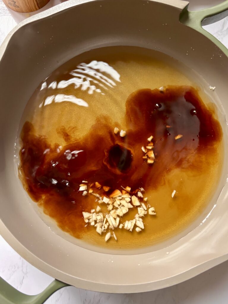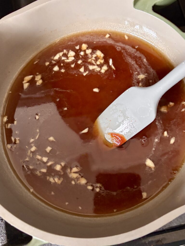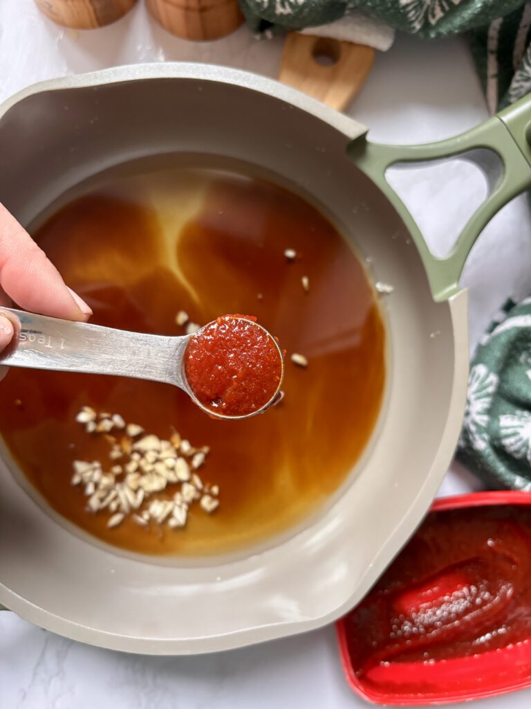 - In a small saucepan, combine rice vinegar, honey, water, soy sauce, gochujang, and garlic.
