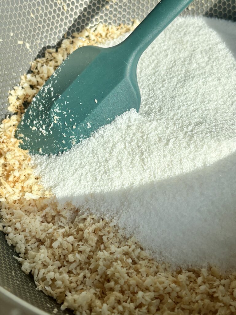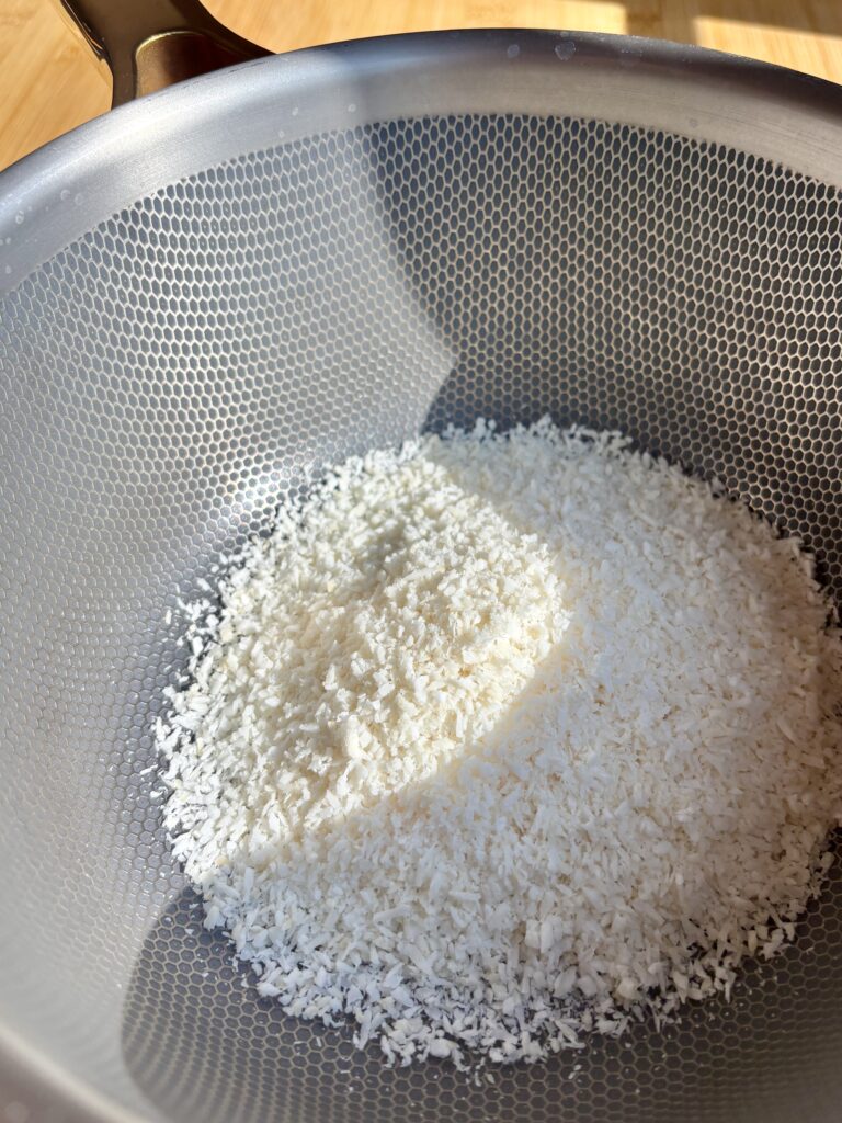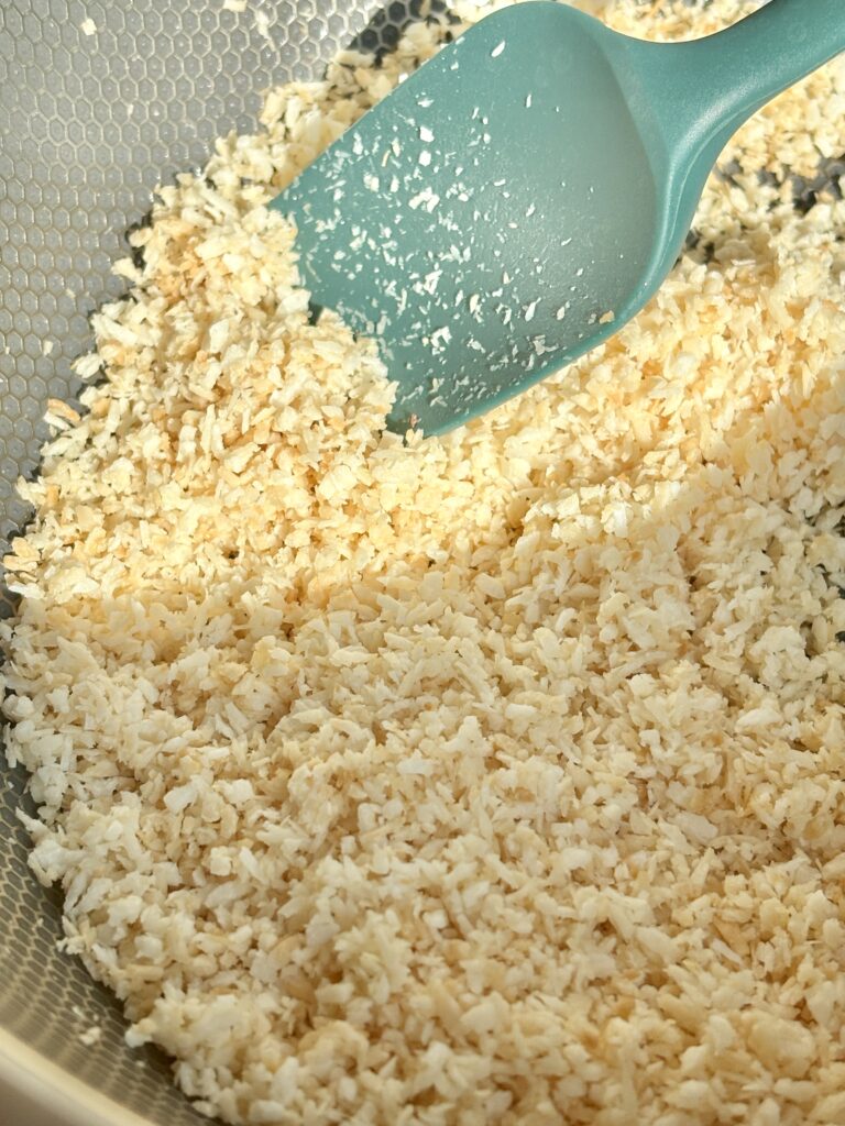 - Add shredded coconut to a dry skillet over medium-low heat. Stir frequently for 3–5 minutes until lightly golden and fragrant. Stay close—it can go from golden to burnt quickly. Remove immediately from heat once toasted.