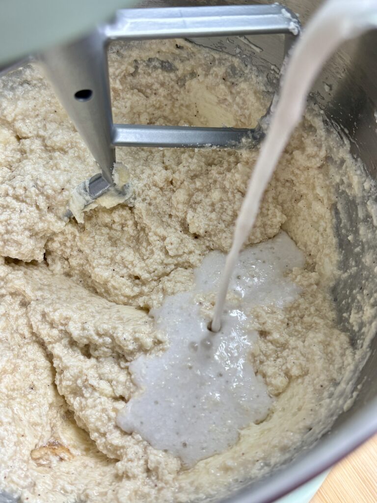 - Then mix in eggs one at a time until combined well. Add in the oil, sour cream, coconut milk, vanilla, coconut extract, and almond extract.