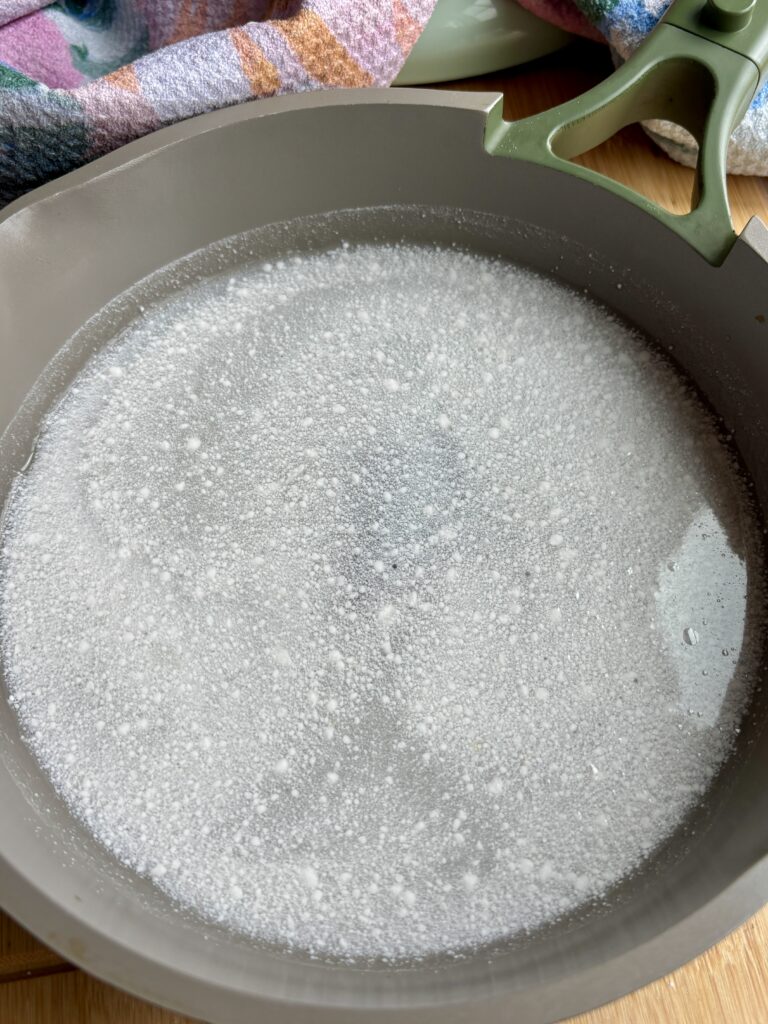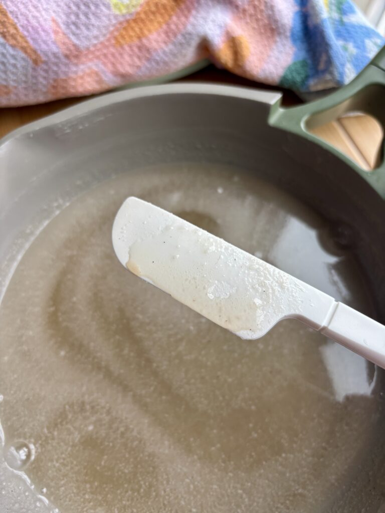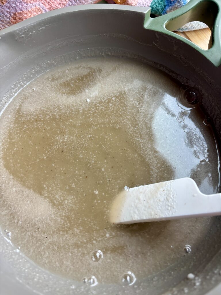 - While the cake is baking, heat all of the syrup ingredients together in a small sauce pan over low-medium heat until the sugar dissolves. Set aside to cool a little.