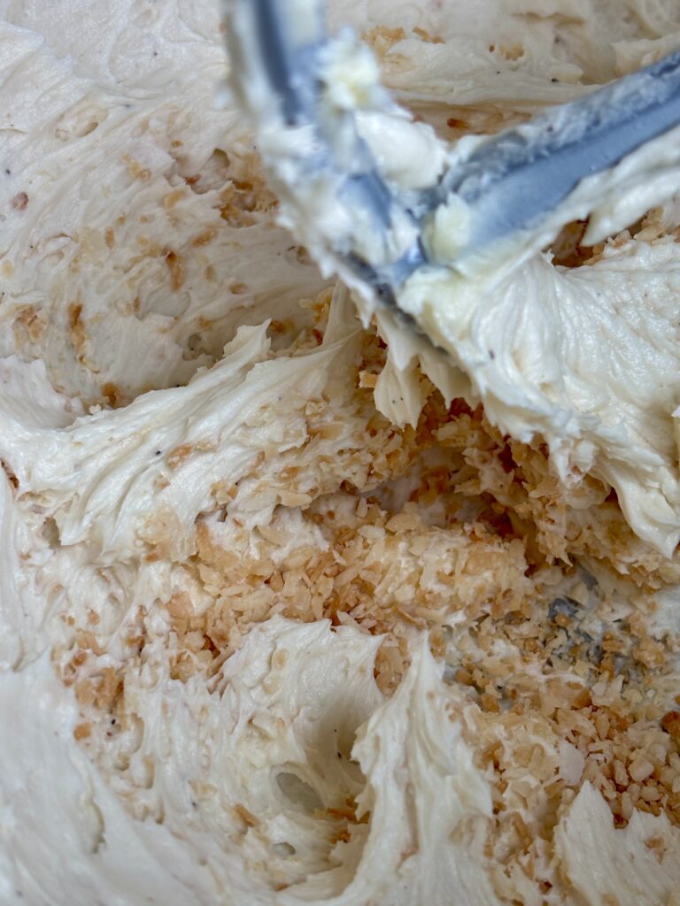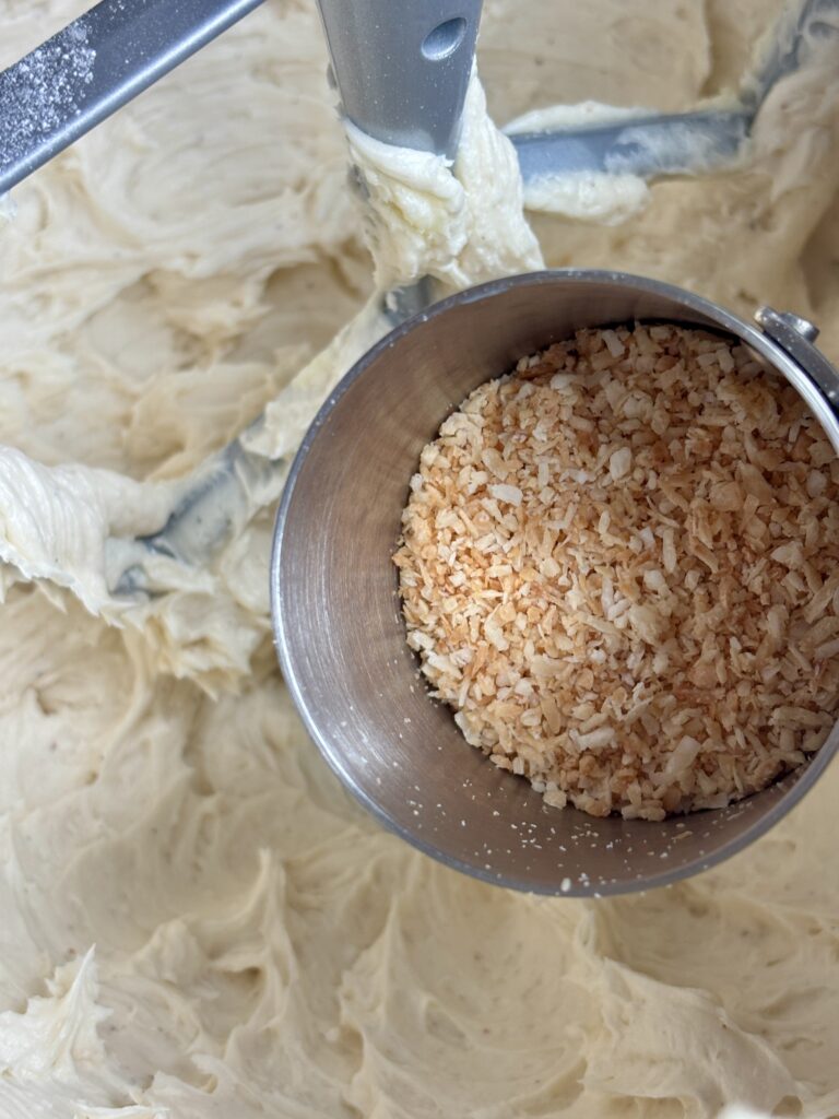 - Toast coconut ahead of time for deeper flavor in the cake and frosting.