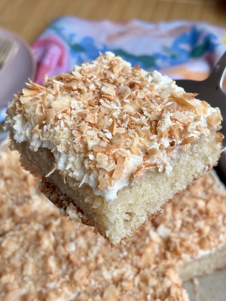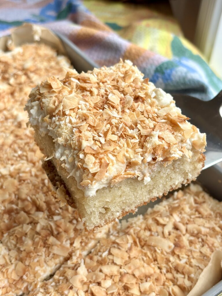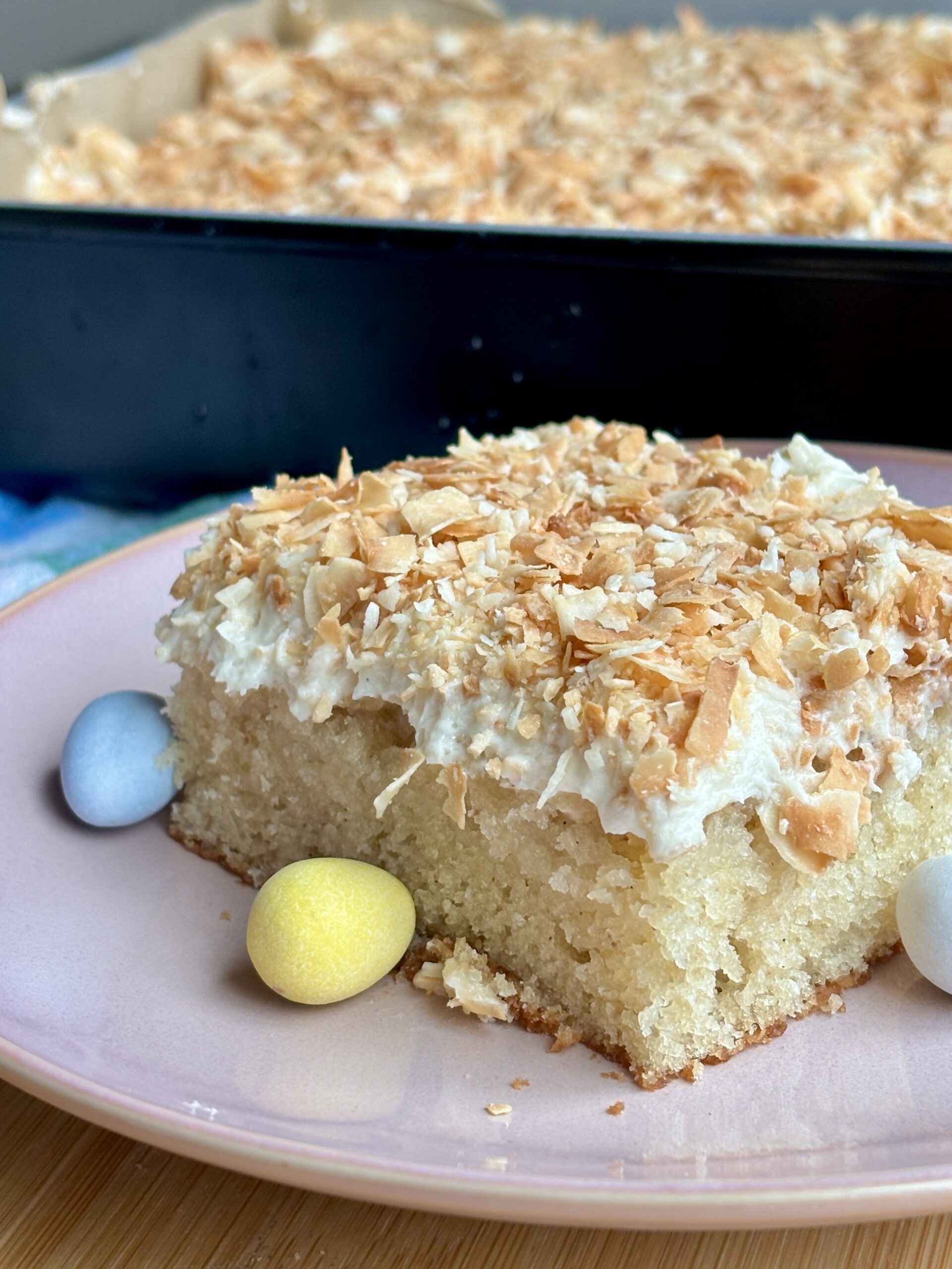 triple coconut cake | coconut sheet cake | coconut cake recipe | moist coconut cake | easter cake recipes | spring desserts | toasted coconut frosting | coconut milk cake | easy sheet cake recipe | bakery style cake | coconut syrup cake