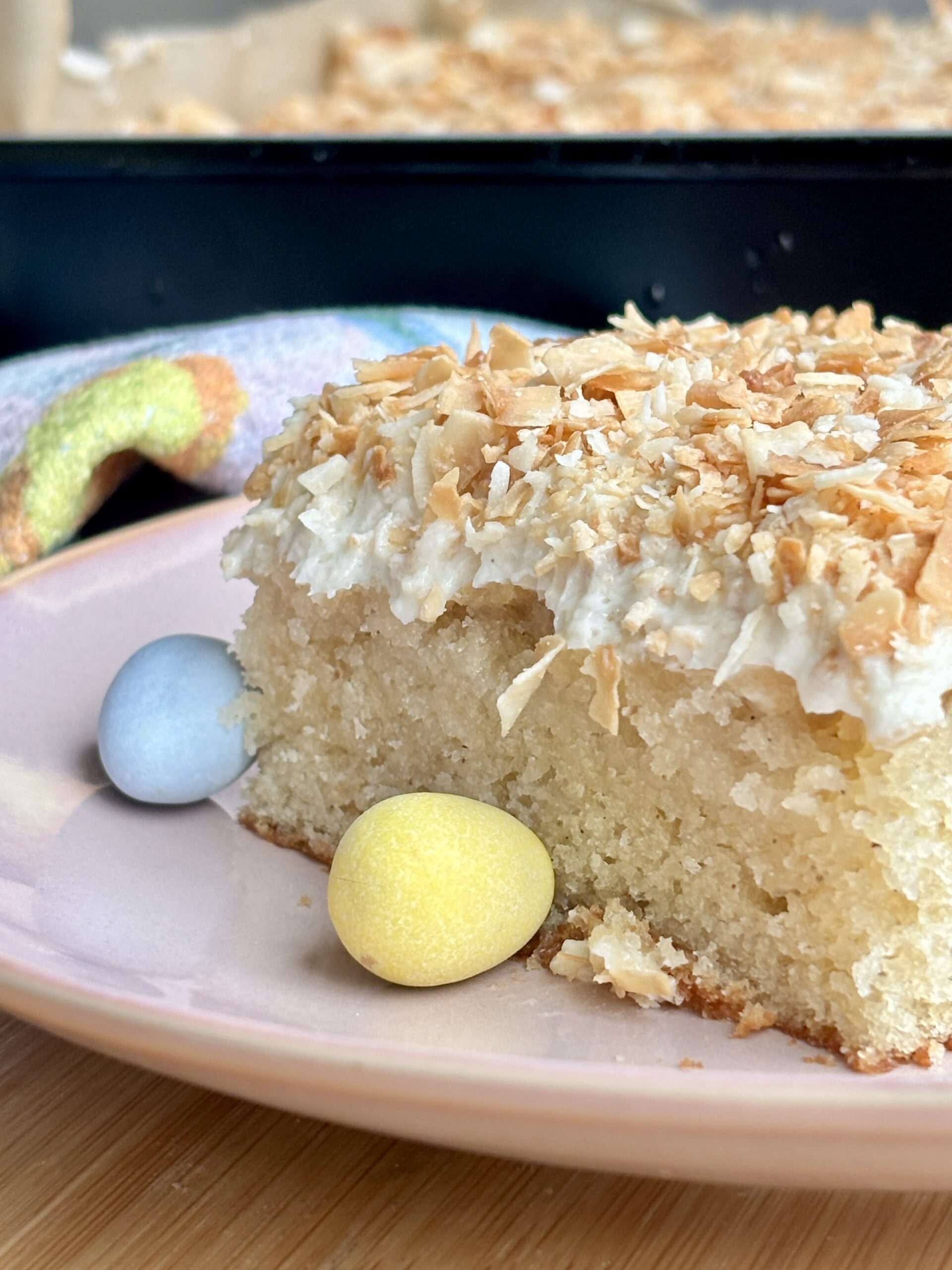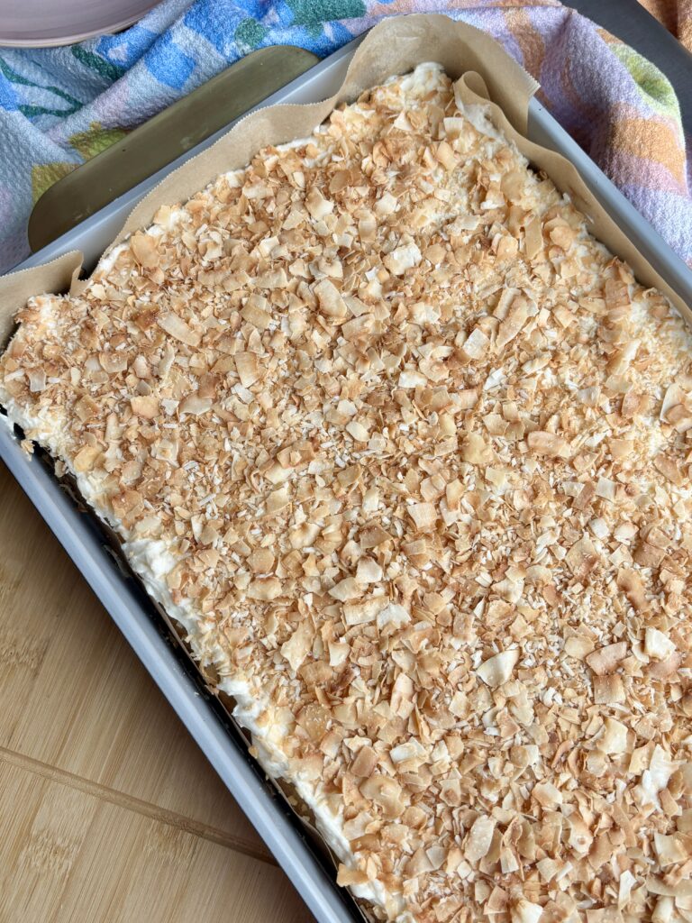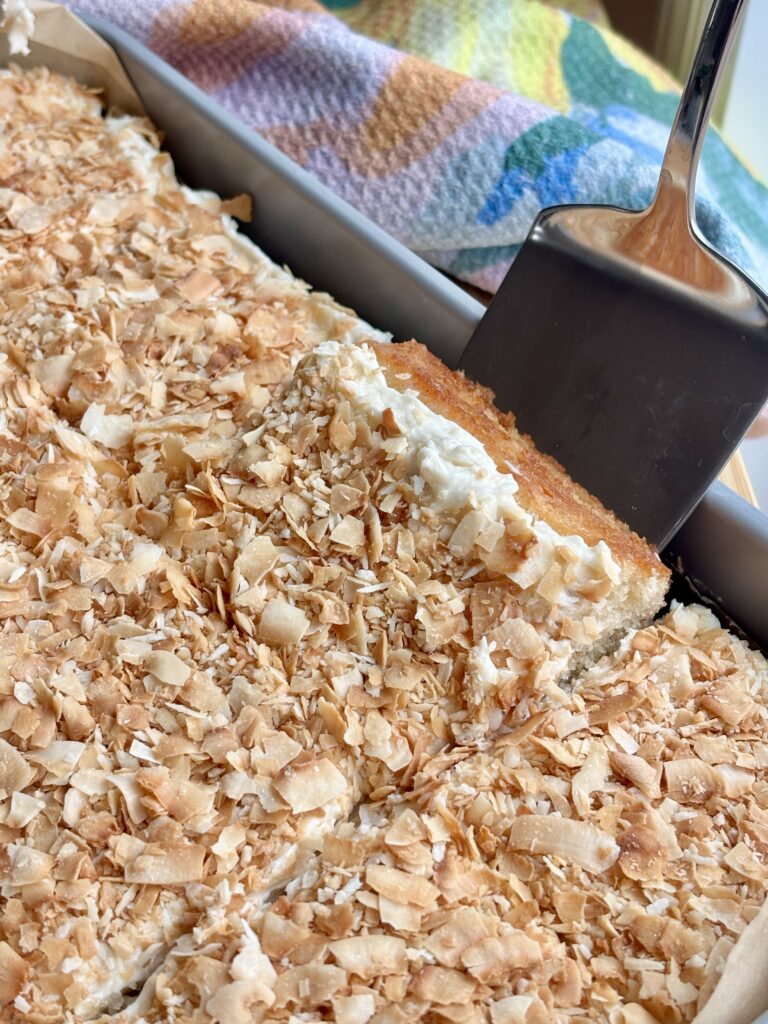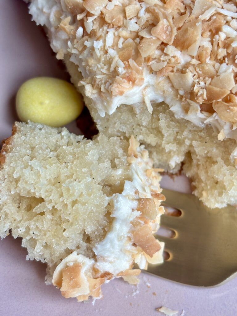 triple coconut cake | coconut sheet cake | coconut cake recipe | moist coconut cake | easter cake recipes | spring desserts | toasted coconut frosting | coconut milk cake | easy sheet cake recipe | bakery style cake | coconut syrup cake