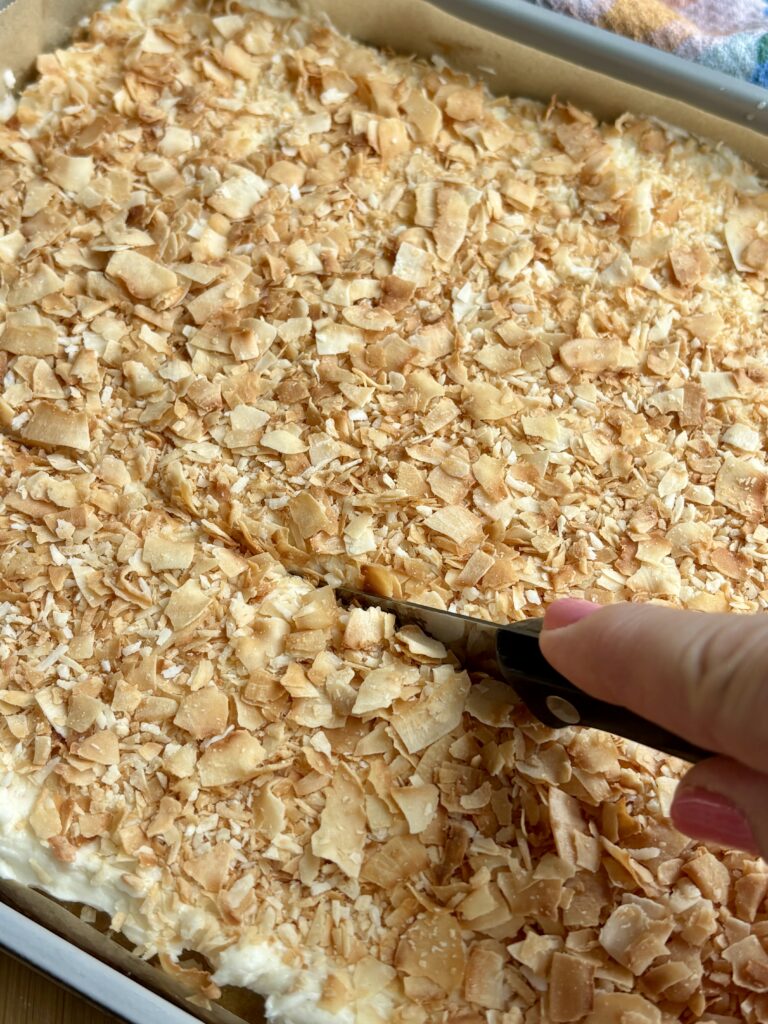 - Spread frosting over cooled cake and top with the remaining toasted coconut.