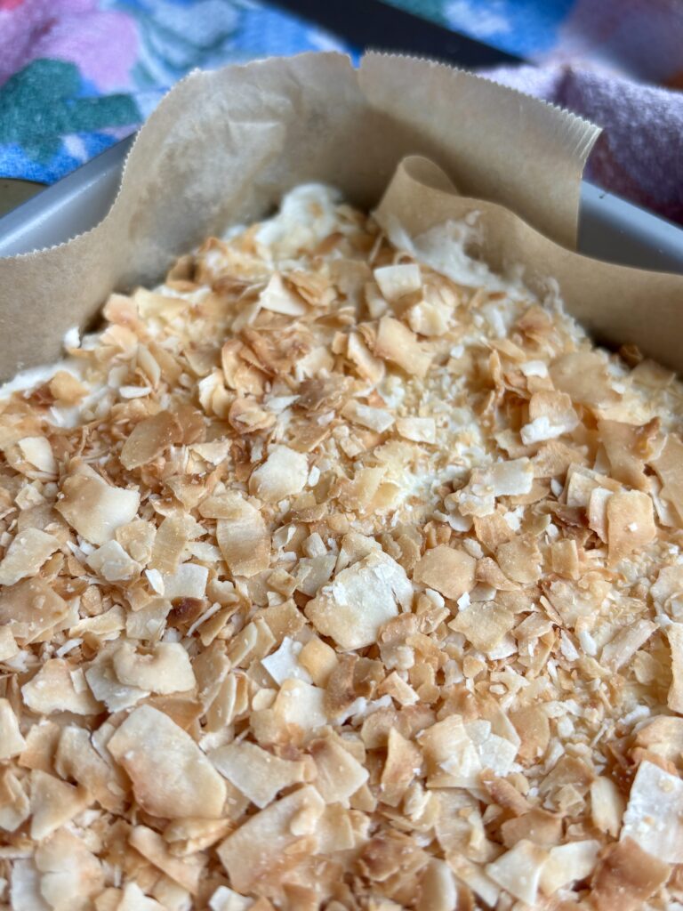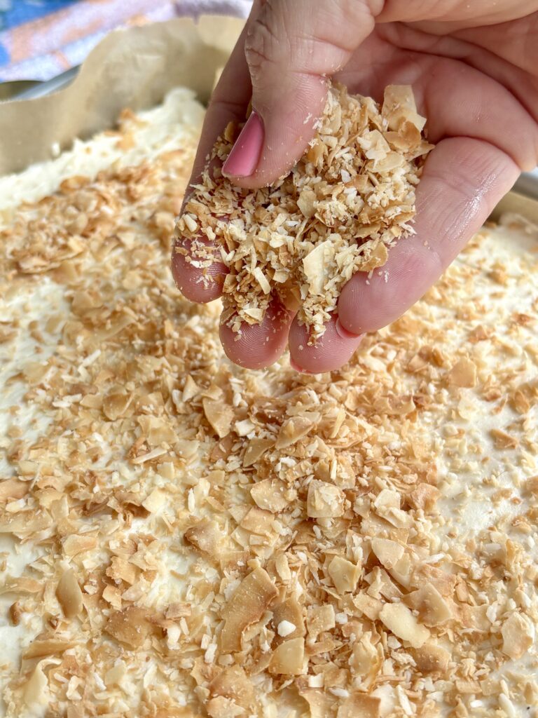 Spread shredded coconut in a thin, even layer on a baking sheet and bake at 325°F for 5–8 minutes, stirring halfway through, until lightly golden. Watch closely as it browns quickly, then let it cool before using.