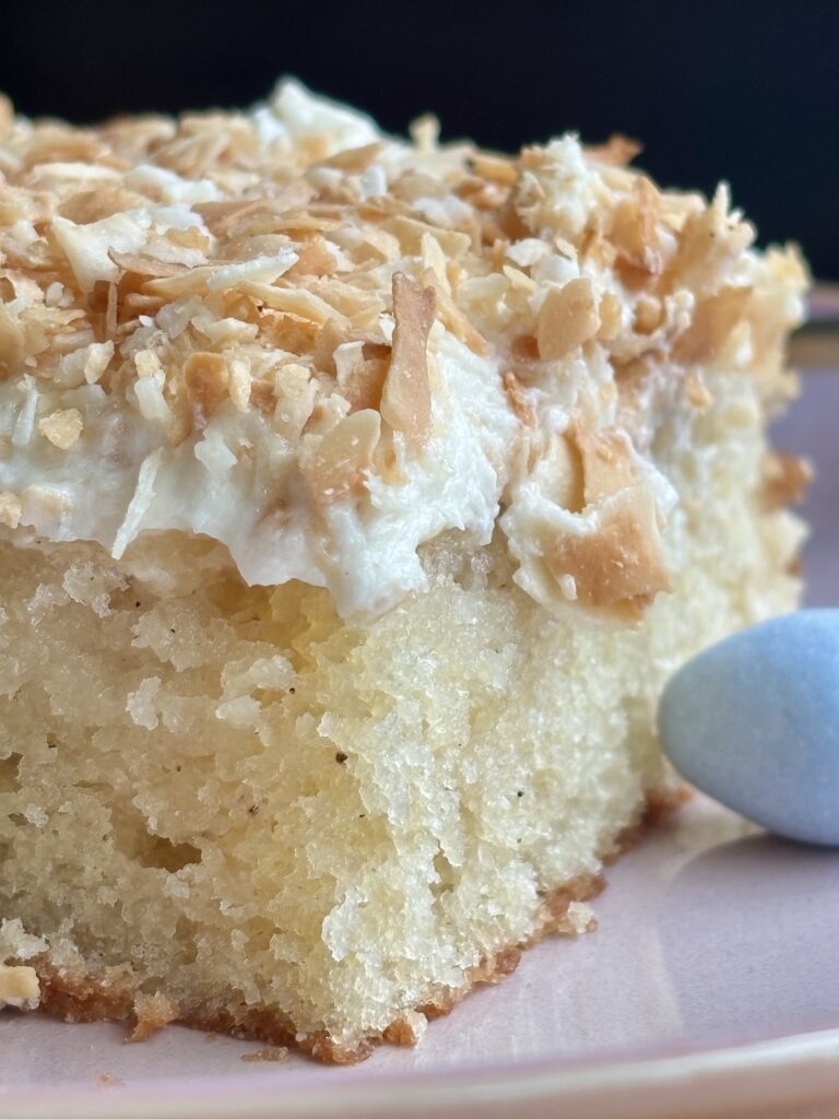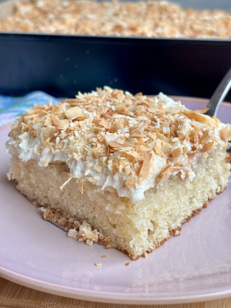 What really sets this cake apart is the balance. It’s deeply coconut forward without being too overpowering, thanks to subtle hints of vanilla and almond that round everything out. The coconut syrup soaks into the cake while it’s still warm, locking in moisture and flavor, while the toasted coconut adds texture and that irresistible bakery style finish.