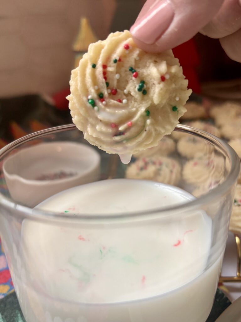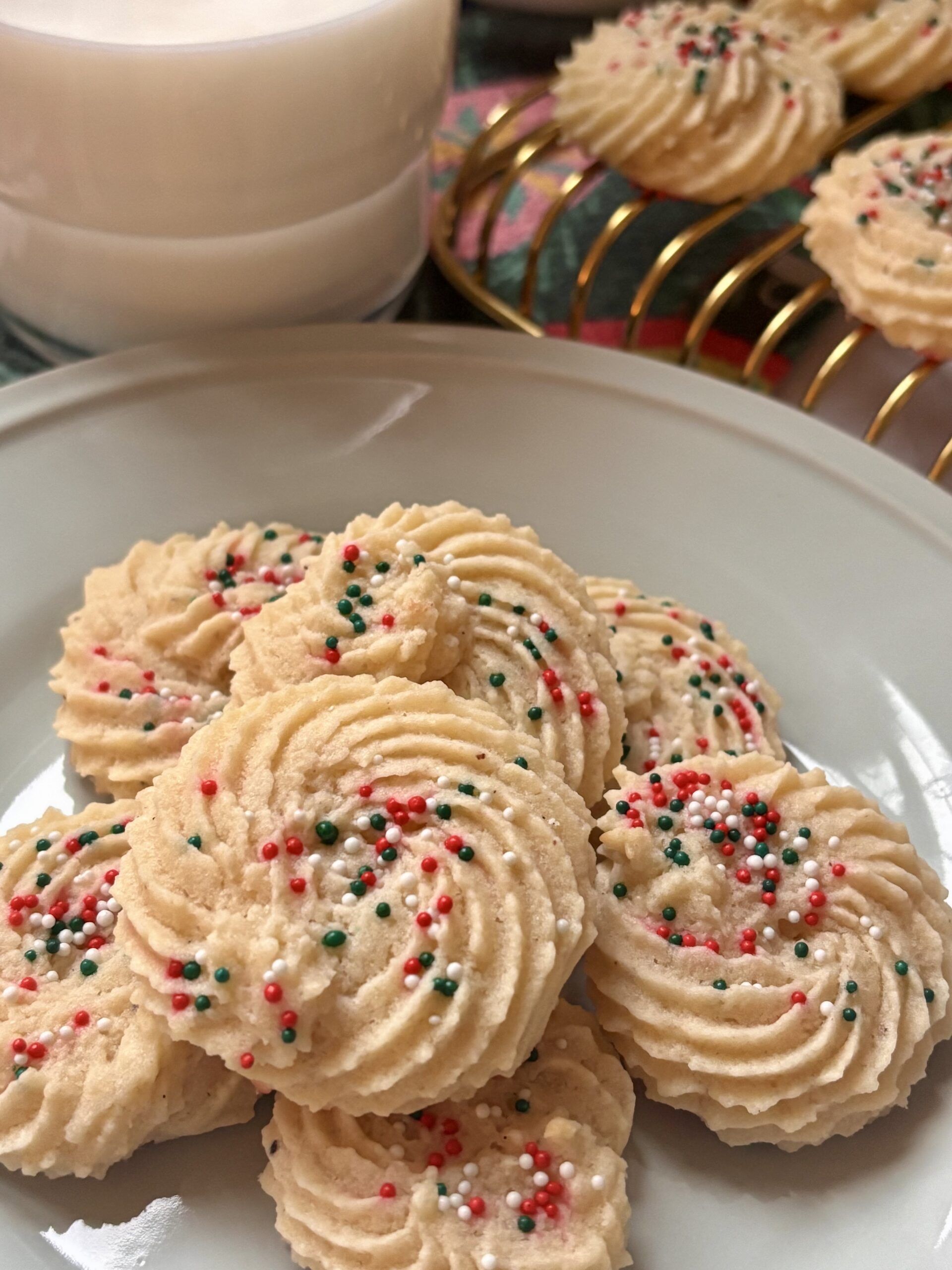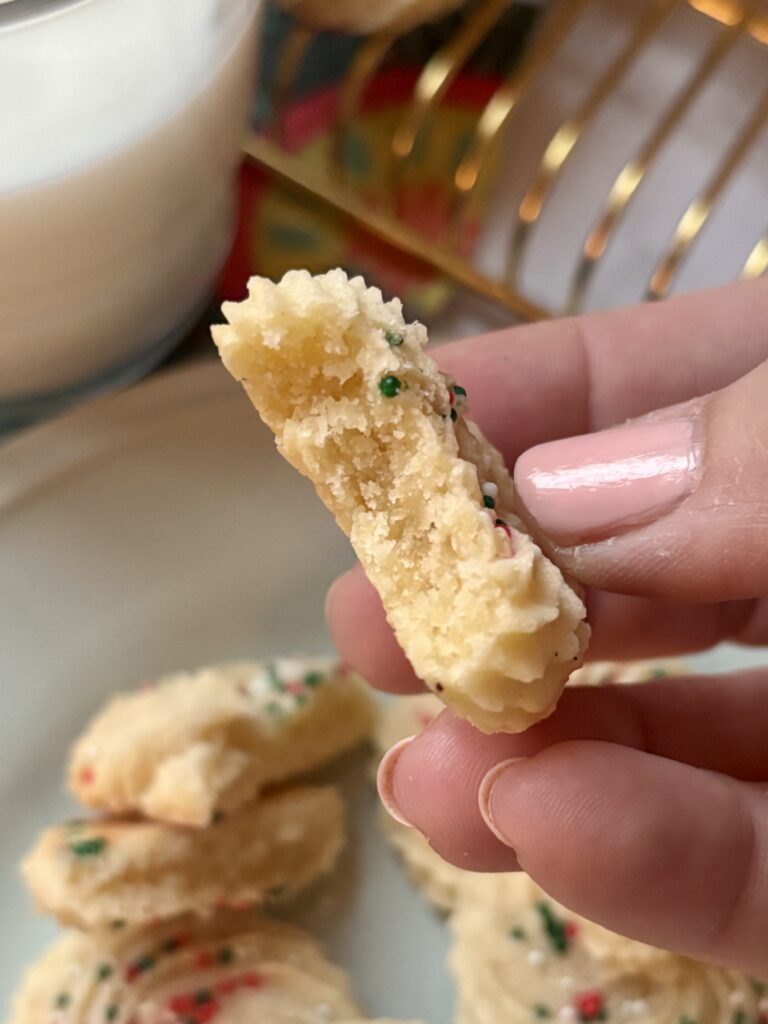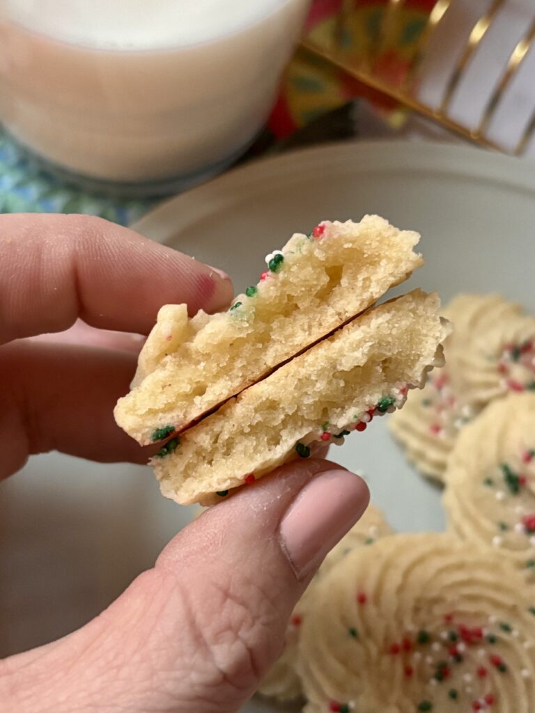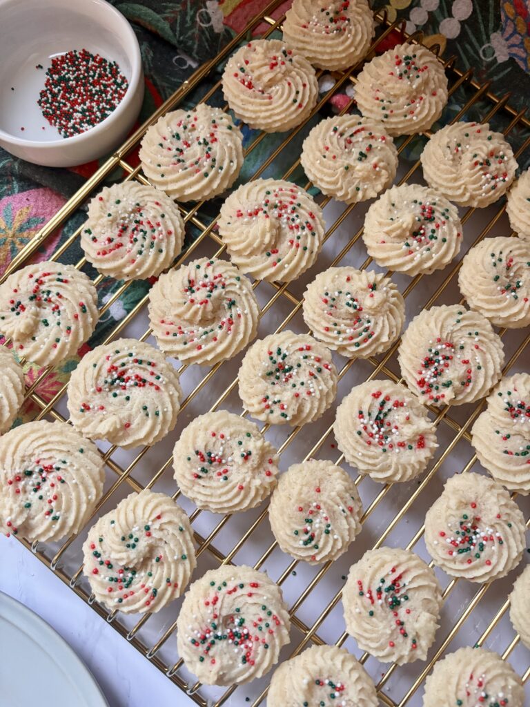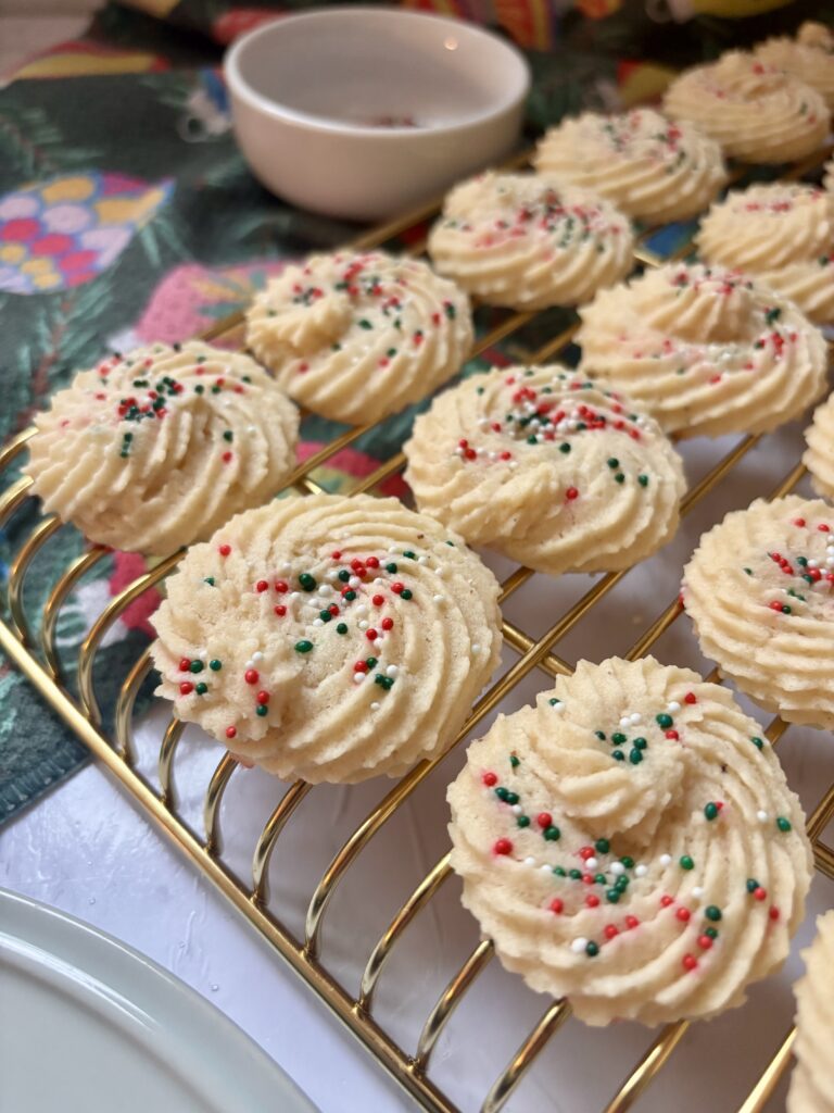 Piped into classic swirls or rosettes, they bake up smooth, pale, and perfectly shaped—just like a bakery style butter cookie. Real vanilla bean paste gives them that rich, aromatic vanilla flavor with beautiful flecks throughout, while a touch of orange juice subtly brightens every bite.