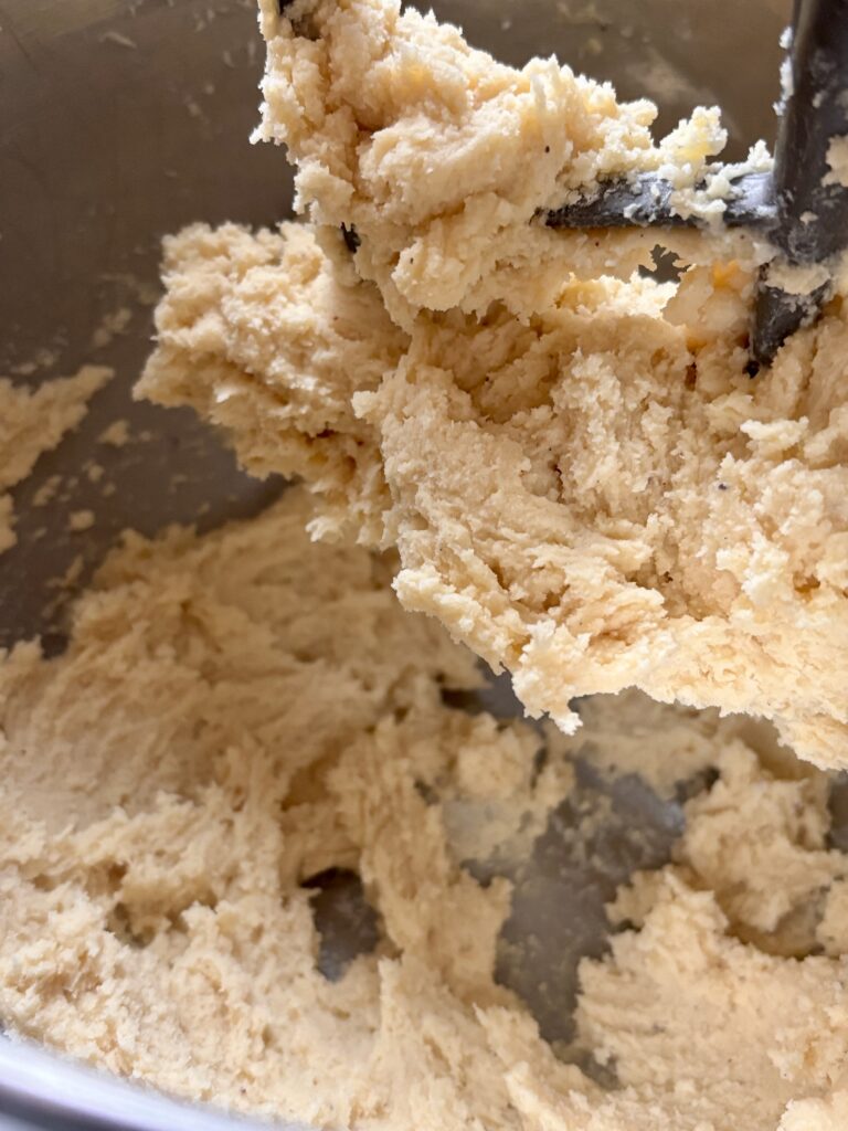 - Add the flour and salt and mix on low speed just until a soft, pipeable dough forms. If the dough feels too stiff to pipe, add 1/2 tbsp more milk.