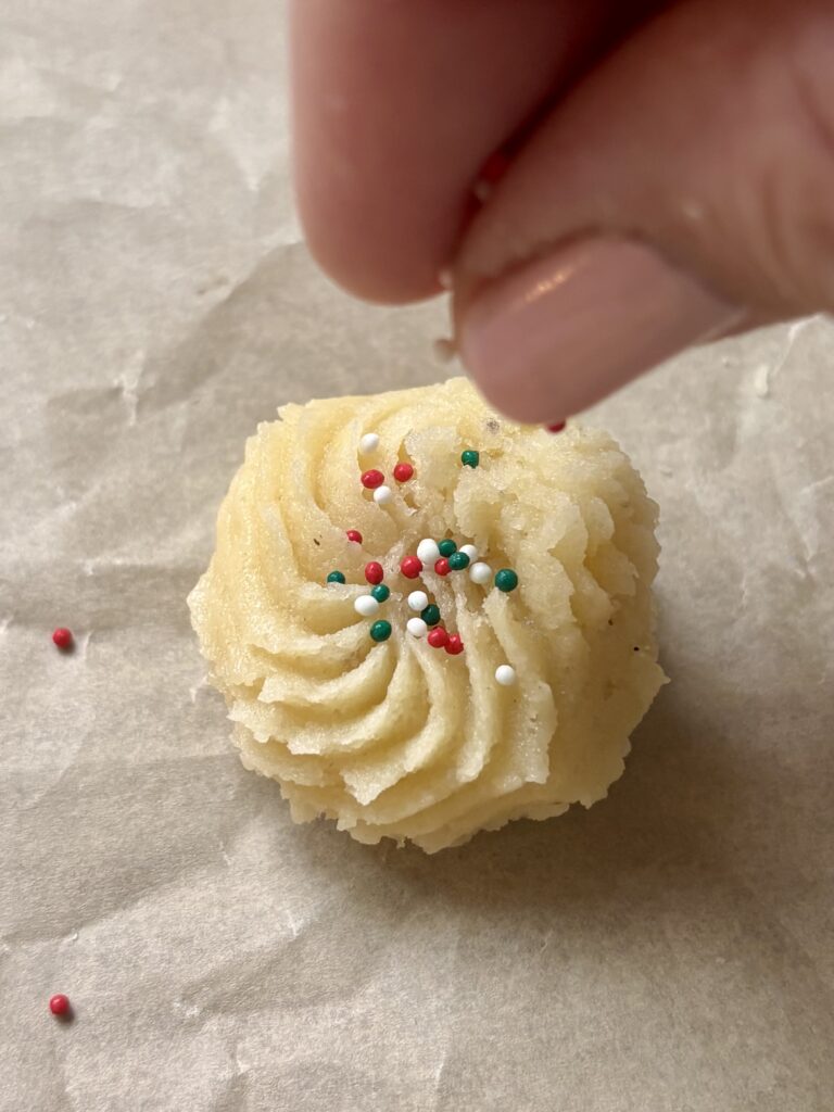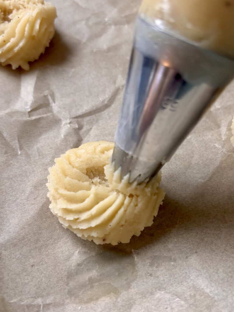 - Pipe swirls, rosettes, or S-shapes onto a parchment lined baking sheet, spacing them 1–2 inches apart. I make them small, around 1 ½ inch round cookies.