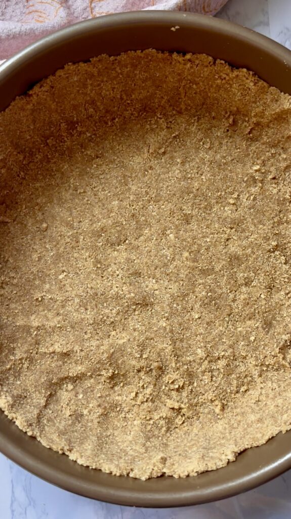 - Press mixture firmly into the bottom and slightly up the sides of a 9-inch springform pan.
