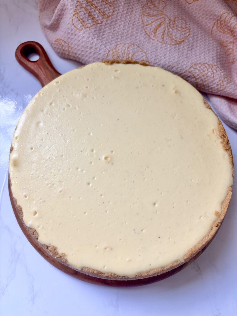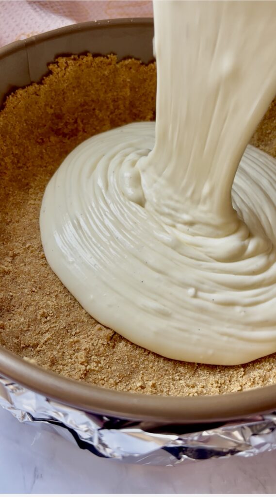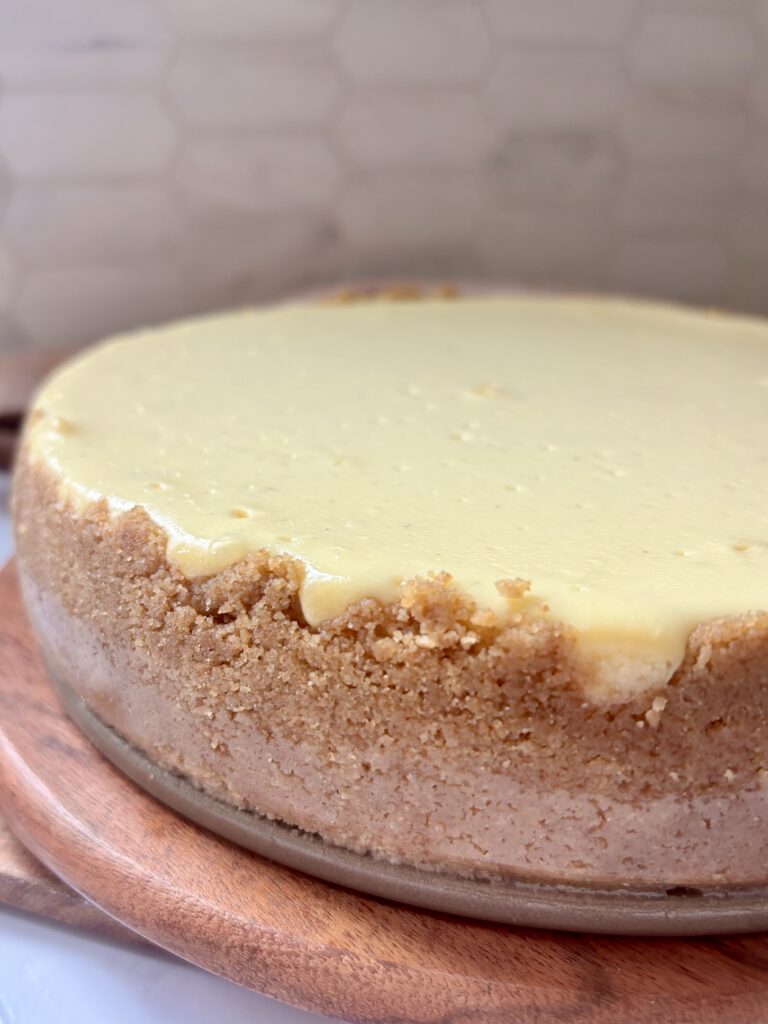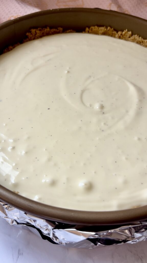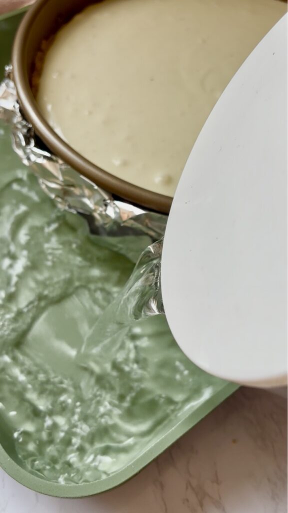 I used to fight the water bath. I tried so many recipes that claimed to be water bath free, but they just didn’t taste the way I wanted it to. So I finally gave in to it and I will never go back. A water bath creates a moist, even baking environment that helps the cheesecake cook gently. This prevents the edges from baking too quickly, reduces the risk of cracks, and ensures a smooth, creamy texture throughout.