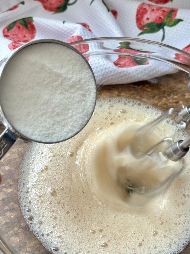 - Slowly drizzle in sugar over 2–3 minutes while continuing to beat. Beat until stiff, glossy peaks form.