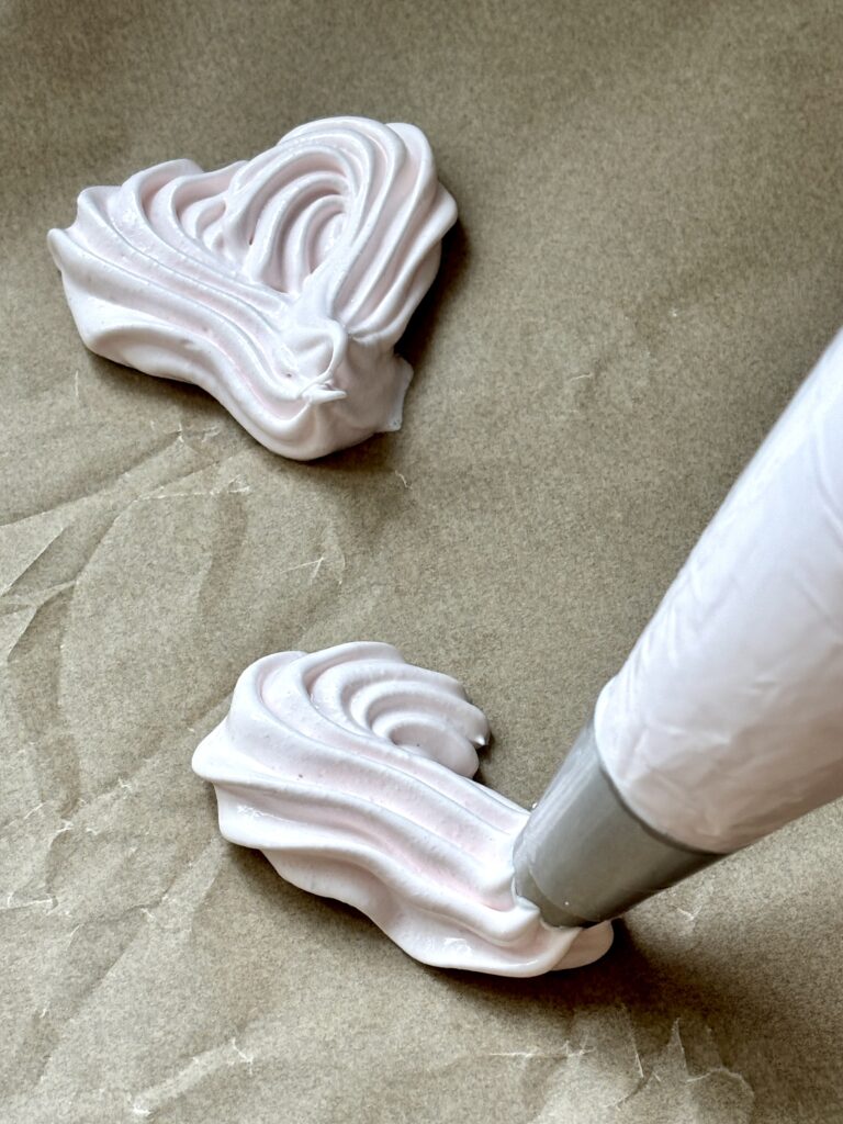 - Transfer meringue to a piping bag fitted with a round or star tip. Pipe heart shapes or small cookies onto prepared baking sheet.