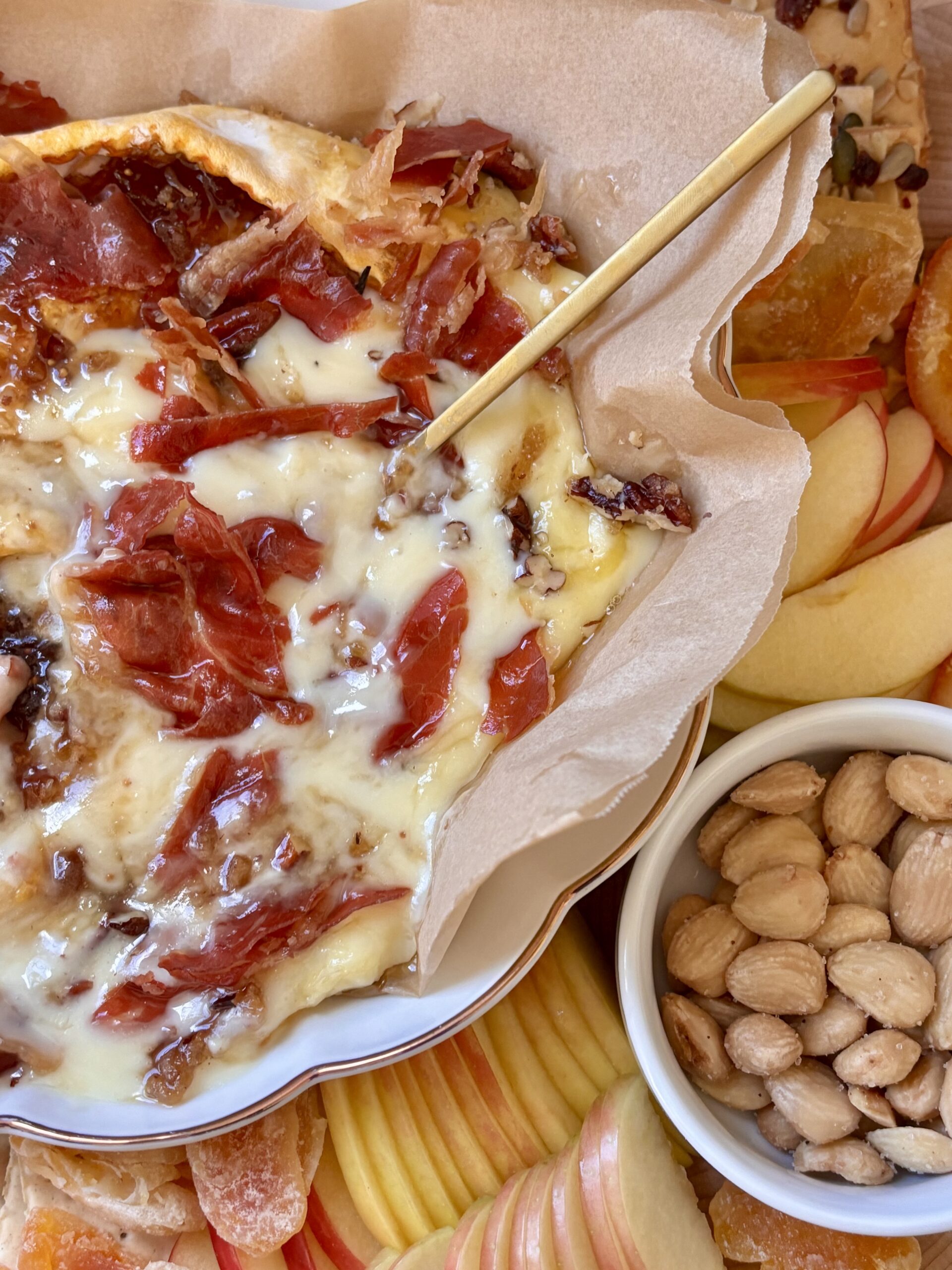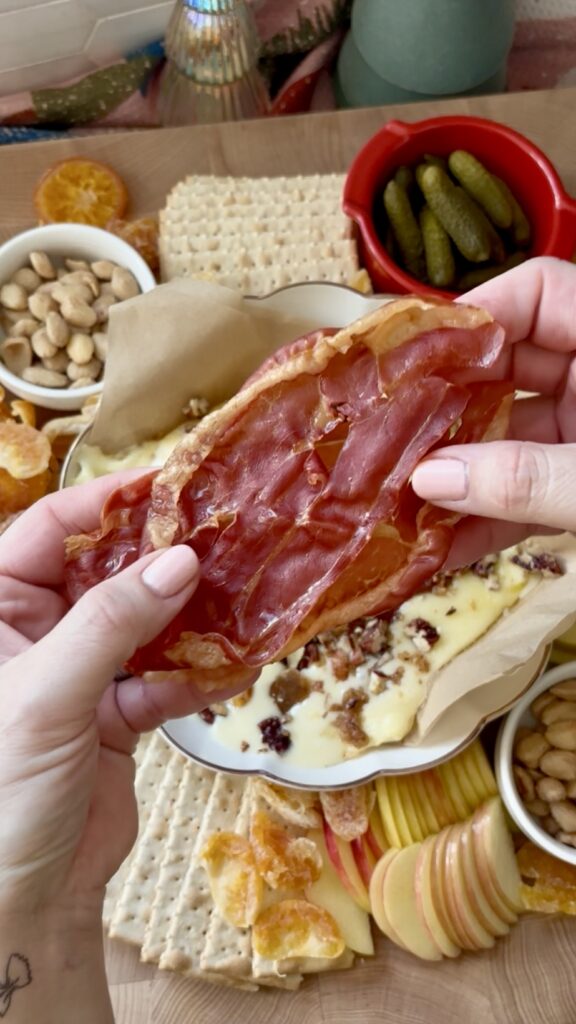 This Warm Le Campagnier with Fig Jam, Candied Nuts and Crispy Prosciutto is one of those appetizers that feels quietly luxurious. It’s a creamy, melty cheese paired with sweet, salty, and crunchy toppings that hit every note just right. The Le Campagnier gently warms in the oven until soft and spoonable, creating the perfect base for fig jam, candied nuts, and shards of crispy prosciutto.