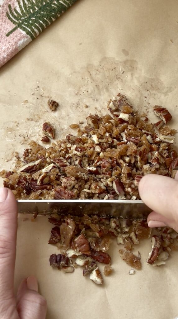 If you can’t find candied pecans at the store, this quick stovetop method works beautifully. Add pecans, a little brown sugar, maple syrup or honey, and a pinch of salt to a nonstick skillet. Cook over medium heat, stirring constantly, until the nuts are glossy and the sugar has melted and coated them evenly, about 4–6 minutes. Spread onto parchment paper and let cool completely before chopping. They’ll crisp up as they cool.